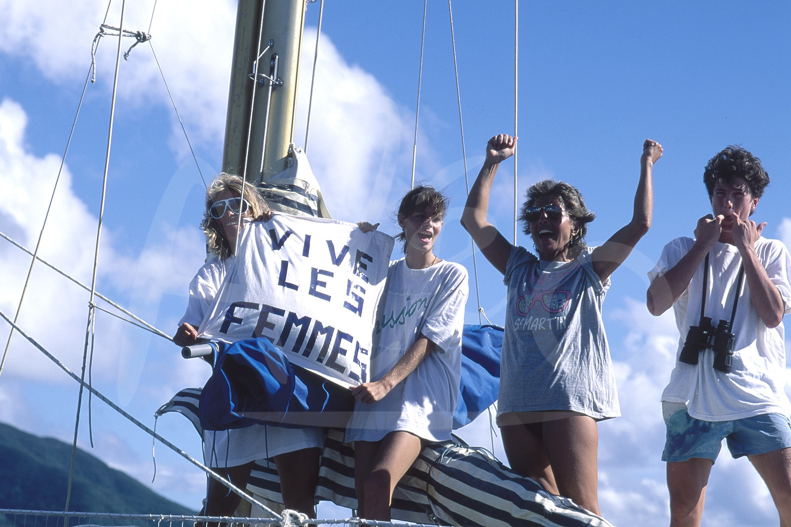 | Description | Supportrices du vainqueur, Skipper Florence Arthaud, trimaran Pierre 1er, à l'arrivée de la Route du Rhum, à Pointe A Pitre, Guadeloupe, le 18 Novembre 1990 - Photo Bernard Rubinstein / ALEA |