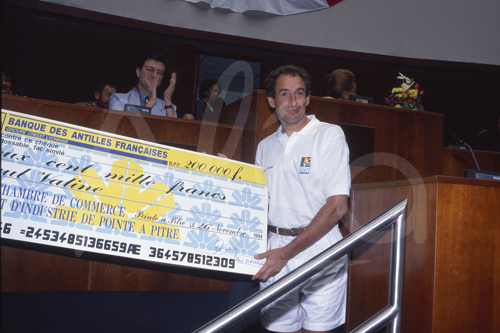 | Description | Remise de prix pour le Skipper Paul Vatine, Région Haute Normandie (2ème), à l'arrivée de la Route du Rhum, à Pointe A Pitre, Guadeloupe, le 27 Novembre 1994 - Photo Bernard Rubinstein / ALEA |