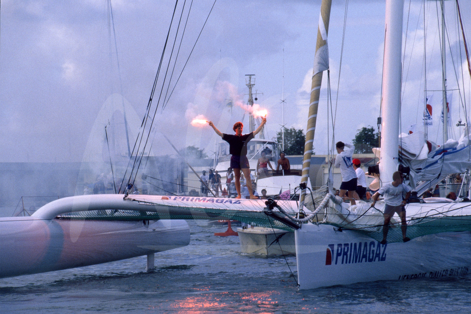 | Description | Célébration avec des feux à main du vainqueur, Laurent Bourgnon, Primagaz, de la Route du Rhum, à Pointe A Pitre, Antilles, le 20 Novembre 1994 - Photo François Mousis / ALEA |