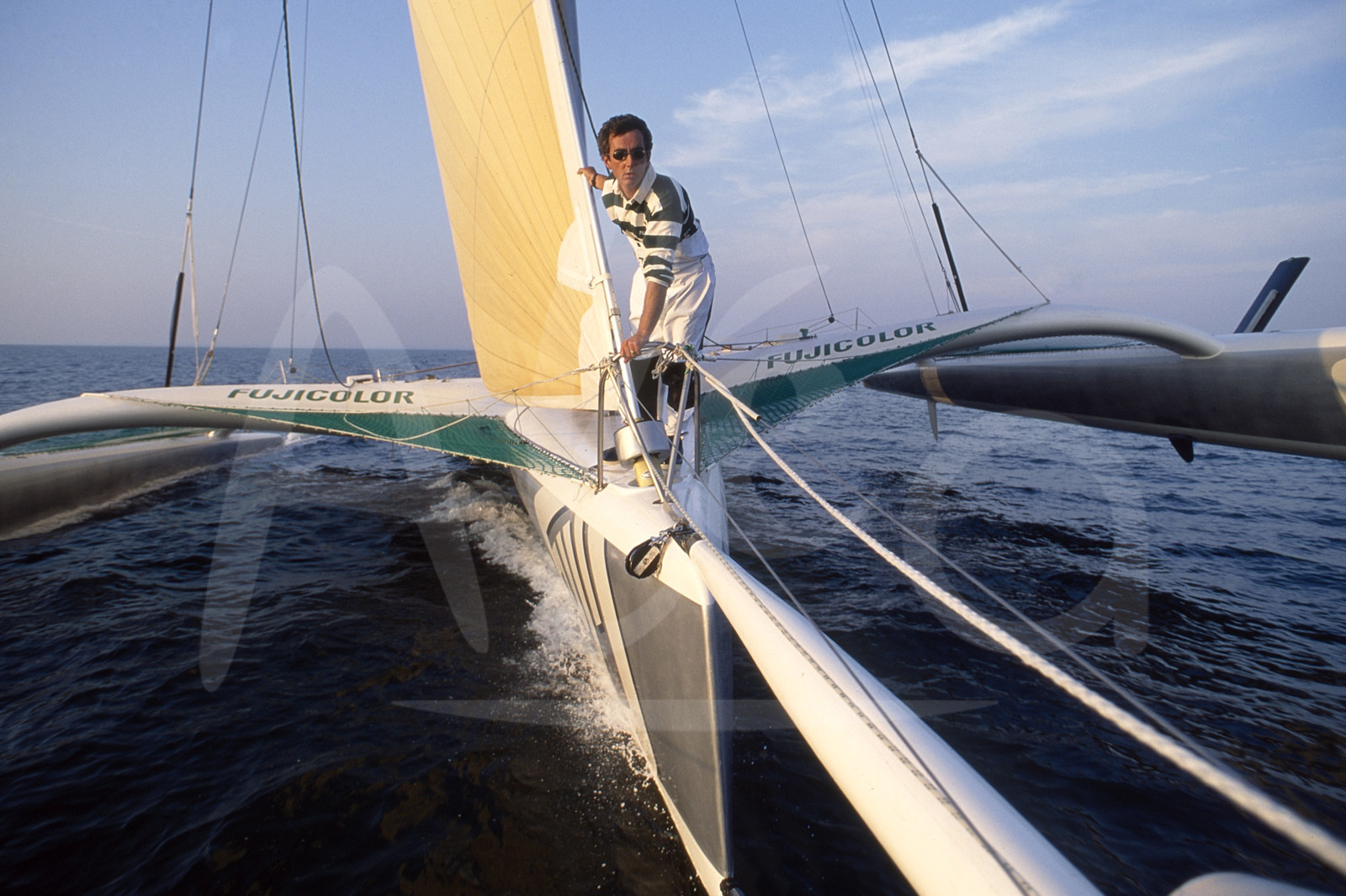 | Description | Skipper Loick Peyron, Fujicolor II, à l'entrainement avant le départ de la Route du Rhum, au large de St-Malo, France, le 21 Octobre 1994 - Photo François Mousis / ALEA |