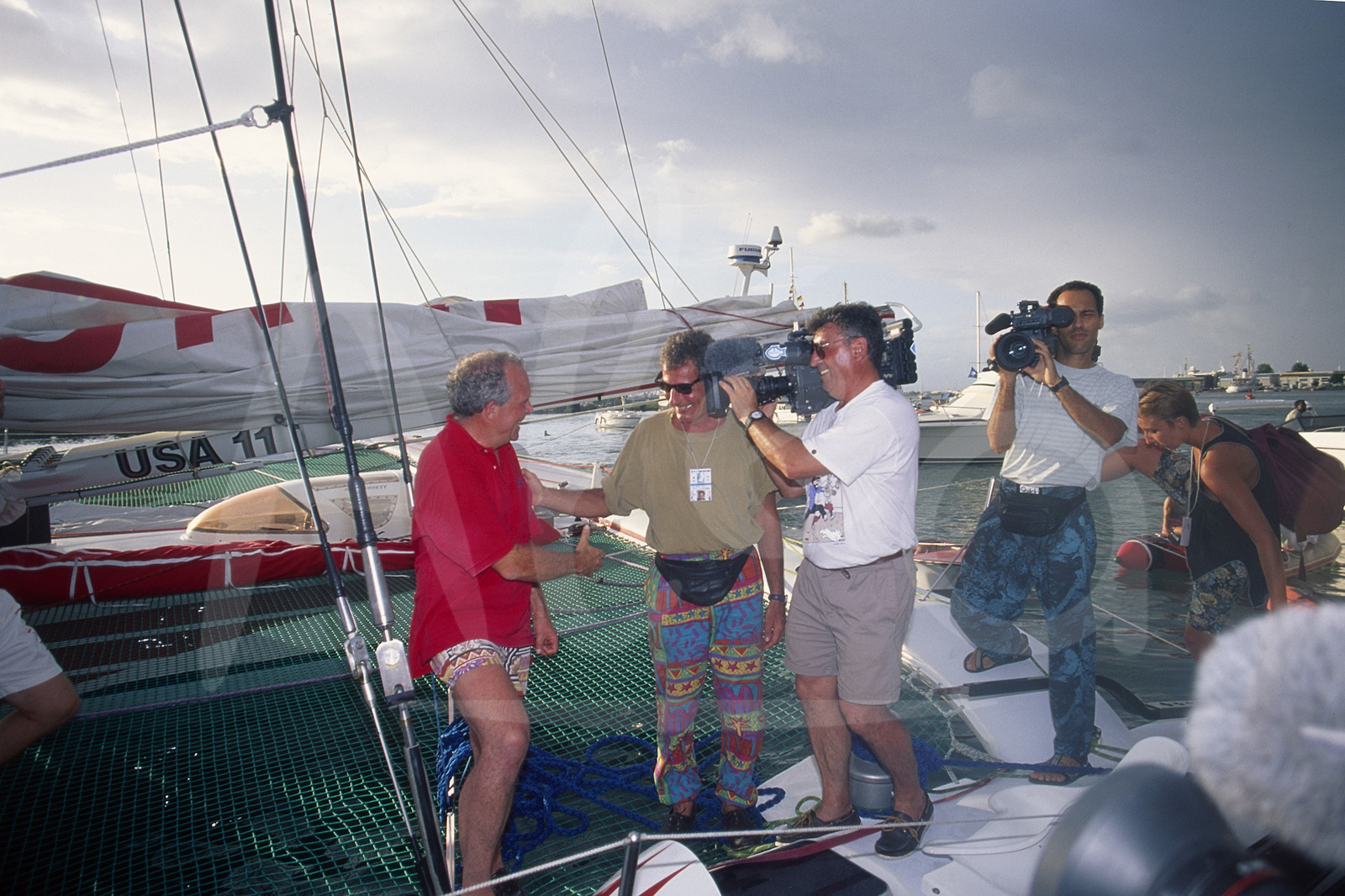 | Description | Ambiance medias pour le Skipper Steve Fossett, trimaran Lakota (Ex-Pierre 1er), à l'arrivée de la Route du Rhum, à Pointe A Pitre, Guadeloupe, le 23 Novembre 1994 - Photo Bernard Rubinstein / ALEA |