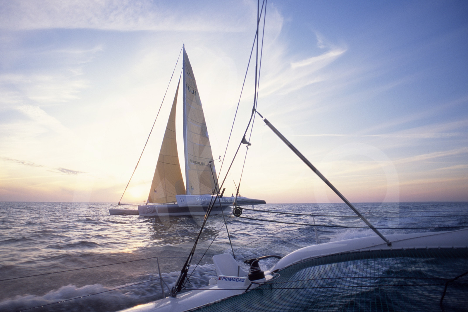 | Description | Skippers Laurent Bourgnon, Primagaz, et Loick Peyron, Fujicolor II, à l'entrainement avant le départ de la Route du Rhum, au large de St-Malo, France, le 20 Octobre 1994 - Photo François Mousis / ALEA |