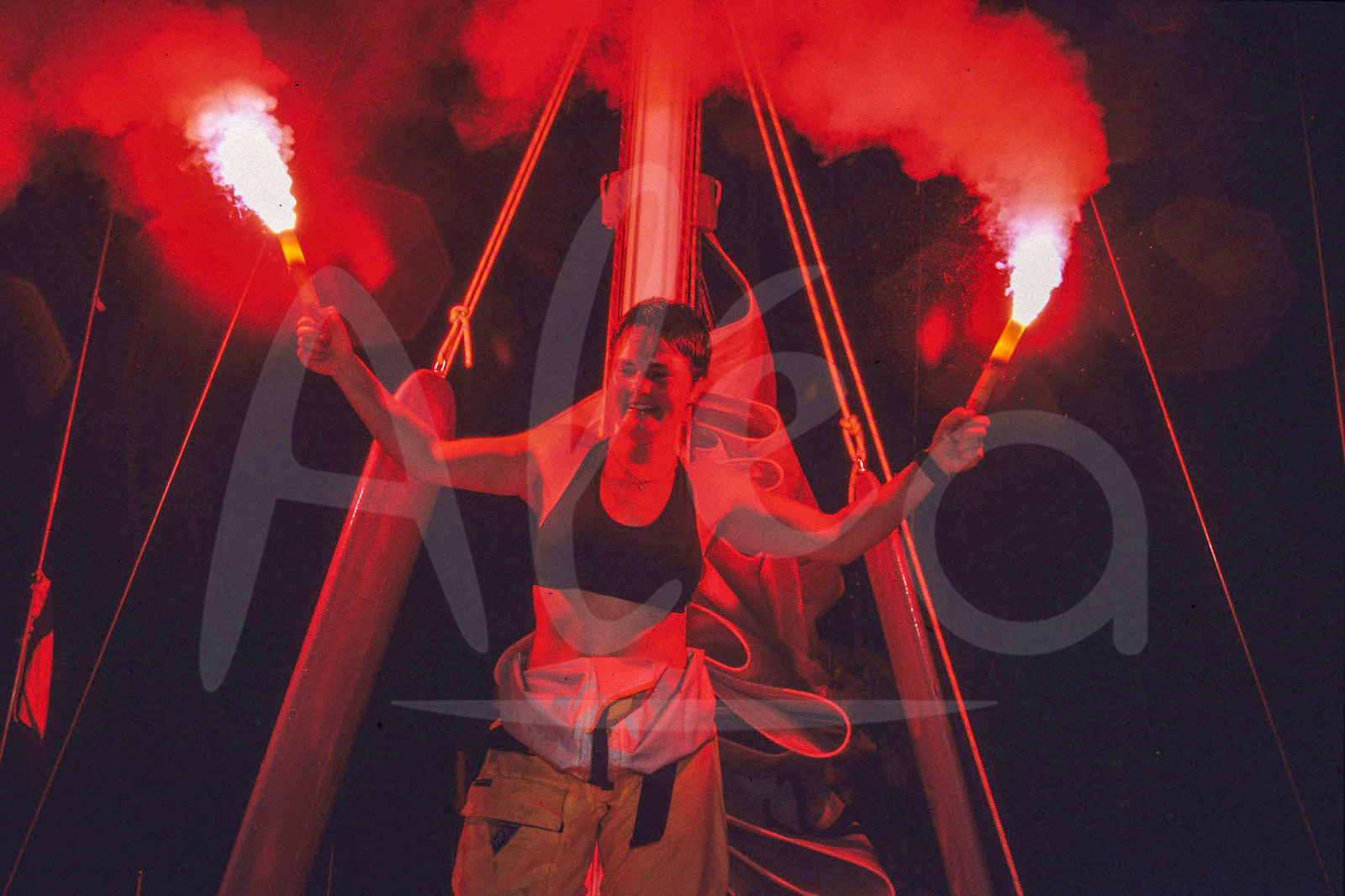 | Description | Ellen MacArthur, skipper Kingfisher, vainqueur en catégorie 50 pieds à l'arrivée de la Route du Rhum 1998, à Pointe à Pitre, Guadeloupe, Novembre 1998, Photo : Jean-Marie Liot / Alea.###.Ellen MacArthur, skipper Kingfisher, winner in 50 feet ranking, during arrival la Route du Rhum 1998, in Pointe à Pitre, Guadeloupe, November 1998, Photo : Jean-Marie Liot / Alea |