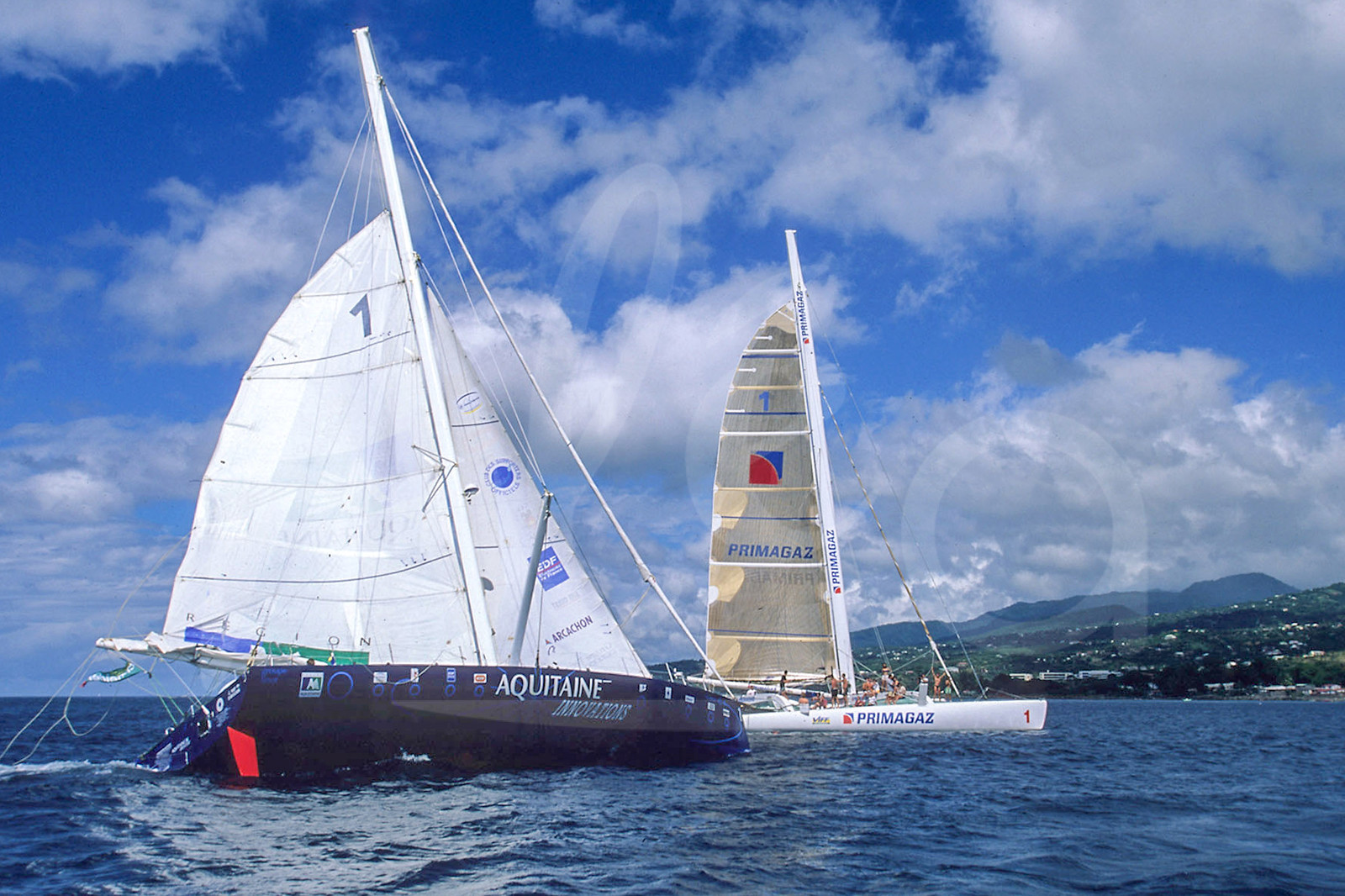 | Description | Arrivée de Thomas Coville, vainqueur de la Roue du Rhum 1998 en catégorie IMOCA à bord d'Aquitaine Innovation, à Pointe à Pitre, Guadeloupe, accueille par Laurent Bourgnon, Photo : Jean-Marie Liot / Alea.###.Arrival Thomas Coville, winner Roue du Rhum 1998 in IMOCA ranking onboard Aquitaine Innovation welcomed by Laurent Bourgnon, Pointe à Pitre, Guadeloupe, Photo : Jean-Marie Liot / Alea |