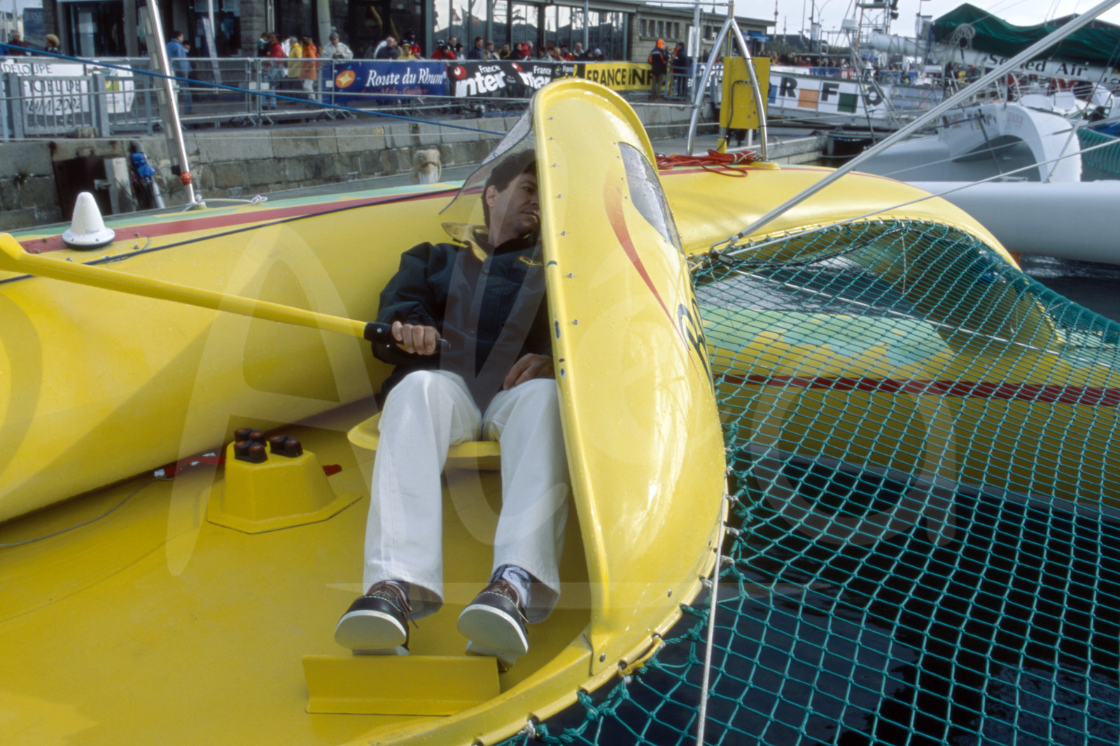 | Description | Illustration des nouvelles protections pour le barreur sur le trimaran Bonduelle, skipper Jean Le Cam, avant le départ de la Route du Rhum, à St Malo, Bretagne, le 8 Novembre 2002 - Photo Bernard Rubinstein / ALEA |