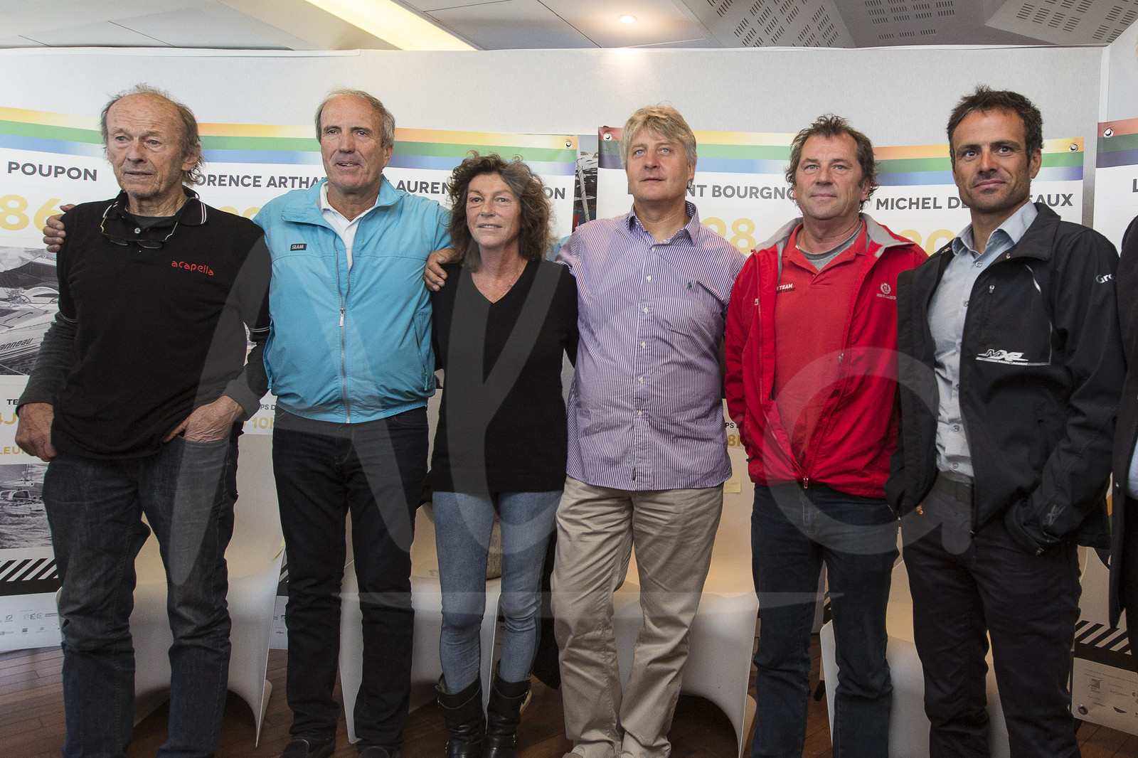 | Description | Rhum winner legends from left to right : Mike Birch (1978), Marc Pajot (1982), Florence Arthaud (1990), Laurent Bourgnon (1994, 1998), Lionel Lemonchois (2002), Franck Cammas (2010) - Missing Philippe Poupon (1986) and Michel Desjoyeaux (2006), in Saint Malo on october 31, 2014 before the Route du Rhum sailing race to start on november 02, 2014 - Photo Jean Marie Liot / ALEA |