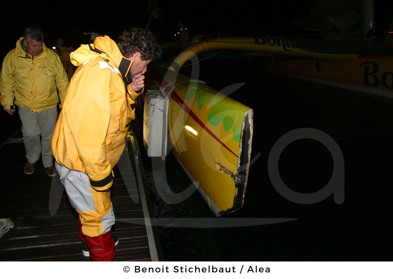| Description | SAILING - ROUTE DU RHUM 2002 - CAMARET (FRA) - BONDUELLE PIT-STOP - MULTIHULLS 60' ORMA - 11/11/2002 - PHOTO : BENOIT STICHELBAUT / ALEA.BONDUELLE / SKIPPER : JEAN LE CAM (FRA) - AFTER COLLISION WITH GROUPAMA CAPSIZED - JEAN DISAPPOINTED NOTES THE DAMAGES TO THE HULL BOW WITH HIS SPONSOR BENOIT BONDUELLE |