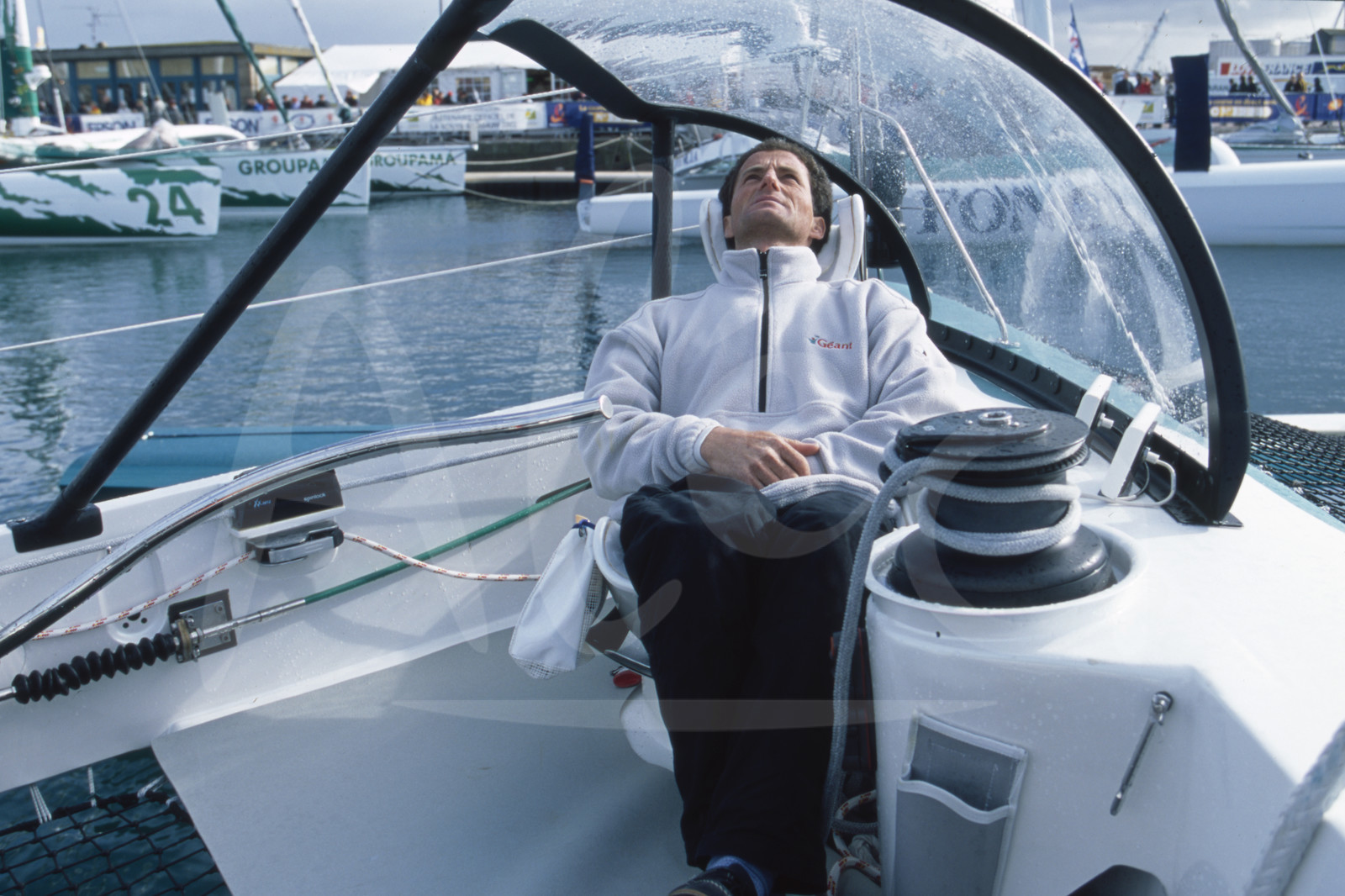 | Description | Illustration des nouvelles protections pour le barreur sur le trimaran Géant, skipper Michel Desjoyeaux, avant le départ de la Route du Rhum, à St Malo, Bretagne, le 8 Novembre 2002 - Photo Bernard Rubinstein / ALEA |