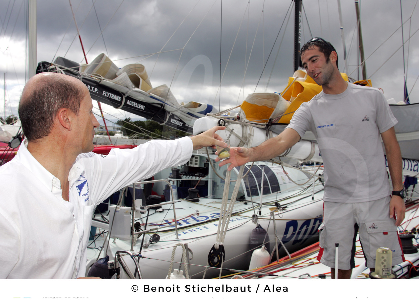 | Description | SAILING - ROUTE DU RHUM LA BANQUE POSTALE 2006 - FINISH POINTE A PITRE (FRA) GUADELOUPE - 11/11/2006.PHOTO : BENOIT STICHELBAUT / ALEA / VIRBAC-PAPREC.IMOCA - BRIT AIR / SKIPPER: ARMEL LE CLEAC'H (FRA) / 4TH / WITH RACE GENERAL MANAGER PIERRE BOJIC (FRA) - LE CLEACH |