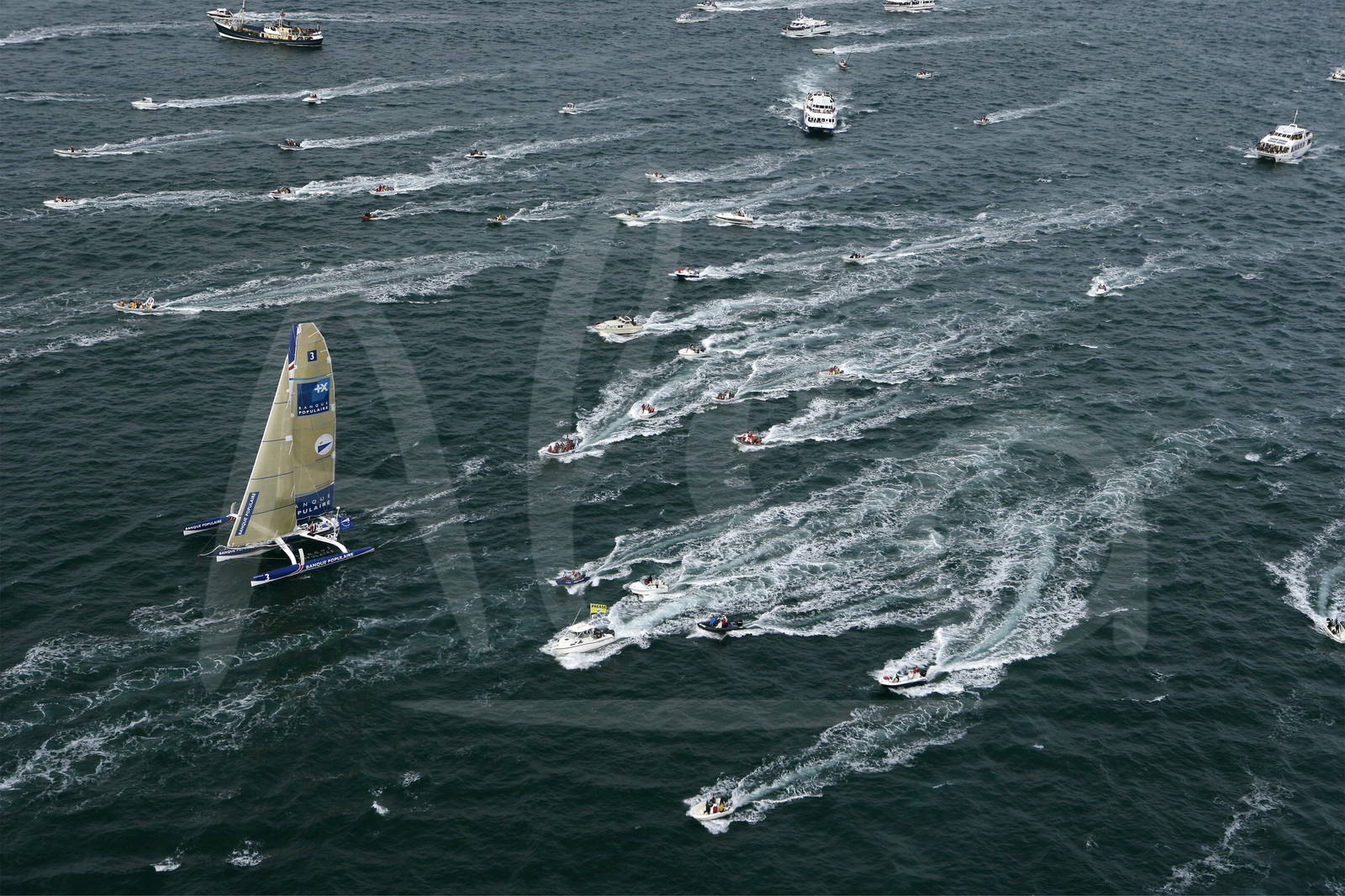 | Description | SAILING - ROUTE DU RHUM LA BANQUE POSTALE 2006 - SAINT-MALO (FRA) - START - 29/10/2006 PHOTO : JEAN-MARIE LIOT / ALEA BANQUE POPULAIRE / SKIPPER : PASCAL BIDEGORRY (FRA) AND THE FLEET OF SPECTATORS BOATS |