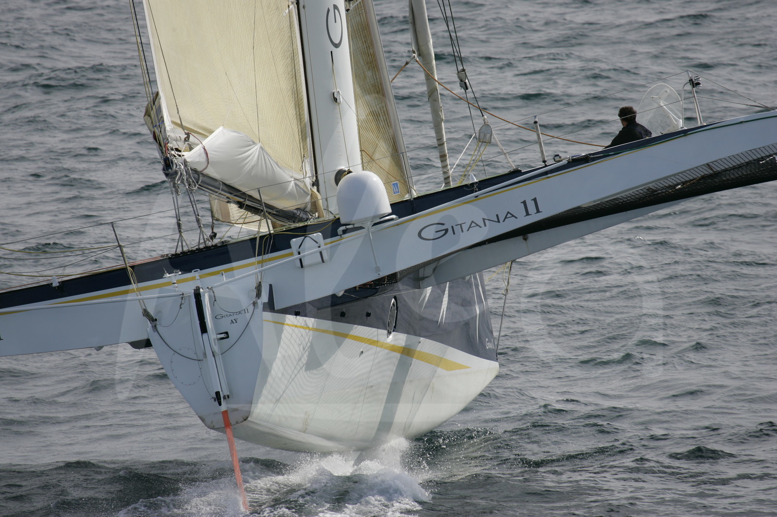 | Description | ROUTE DU RHUM 2006.TRIMARAN 60' GITANA 11 - SKIPPER : LIONEL LEMONCHOIS.LE 27 SEPTEMBRE 2006.© B.STICHELBAUT / Alea |