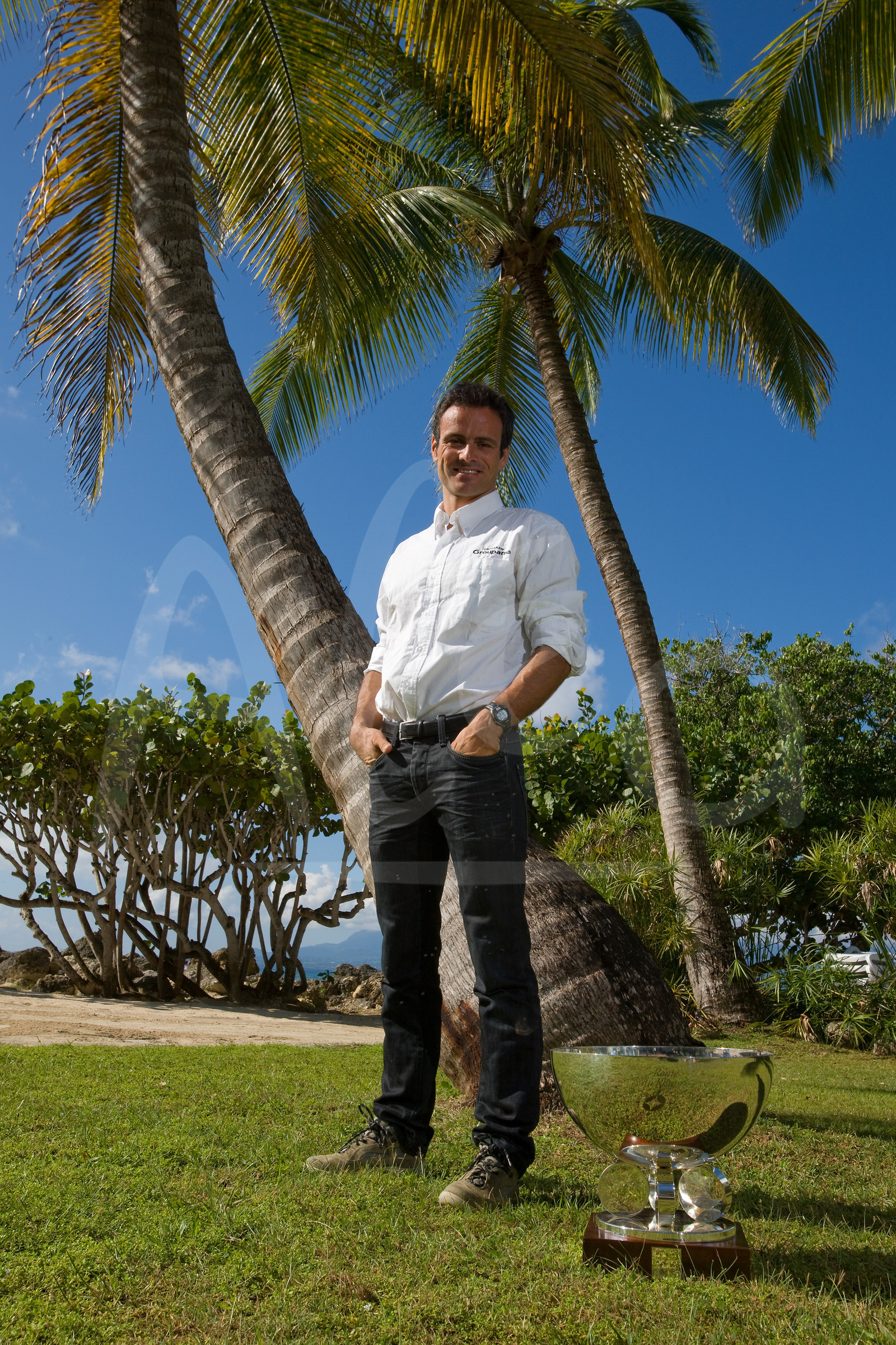 | Description | SAILING - ROUTE DU RHUM 2010 - 16/11/2010 - POINTE A PITRE (GUADELOUPE - FRA) BEACH OF CREOLE HOTEL - PHOTO : JEAN MARIE LIOT / ALEA - FRANCK CAMMAS WITH THE TROPHY |