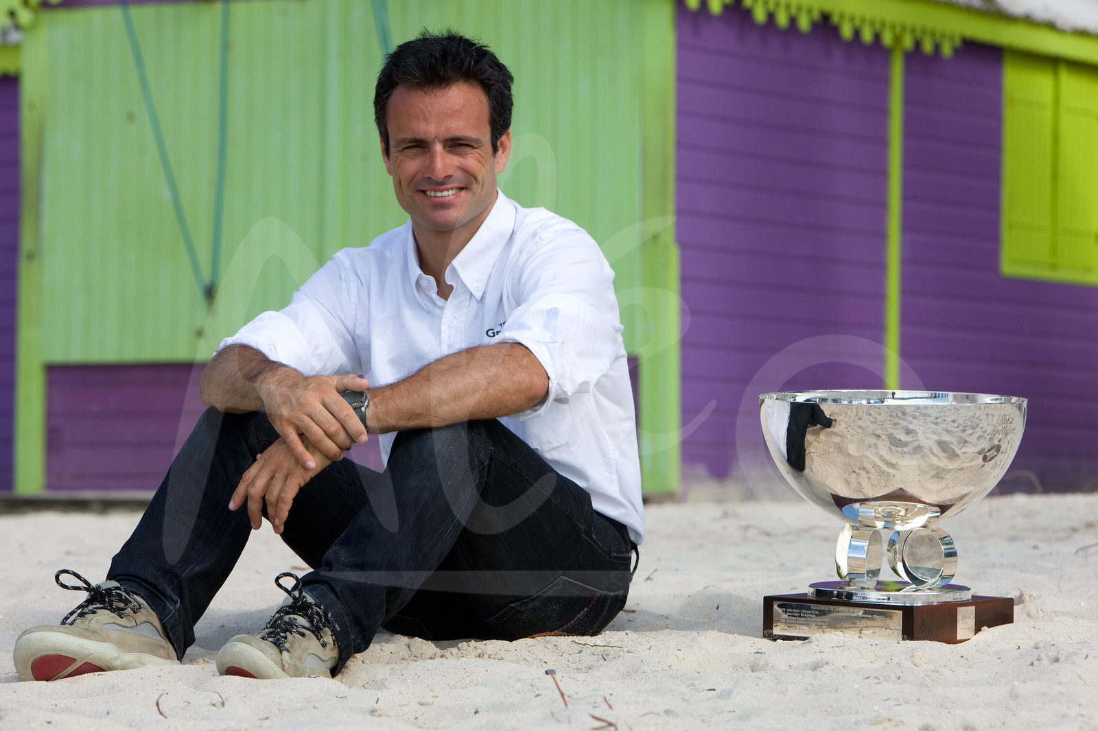 | Description | SAILING - ROUTE DU RHUM 2010 - 16/11/2010 - POINTE A PITRE (GUADELOUPE - FRA) BEACH OF CREOLE HOTEL - PHOTO : JEAN MARIE LIOT / ALEA - FRANCK CAMMAS WITH THE TROPHY |