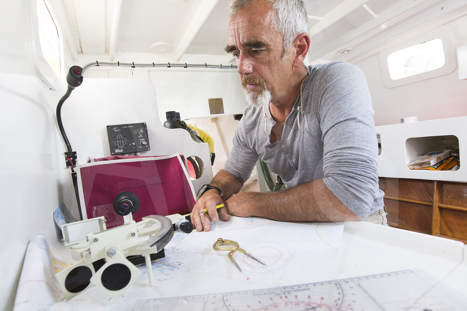 | Description | Loick Peyron inside his "Happy" boat in La Trinite sur Mer, Brittany, Peyron wants to sail this sistership of Mike Birch Olympus Photo, winner of the 1st Route du Rhum 1978, during the 2014 edition, using old method as a sextant and a compass - june 27, 2014 - Photo Jean Marie Liot / ALEA |