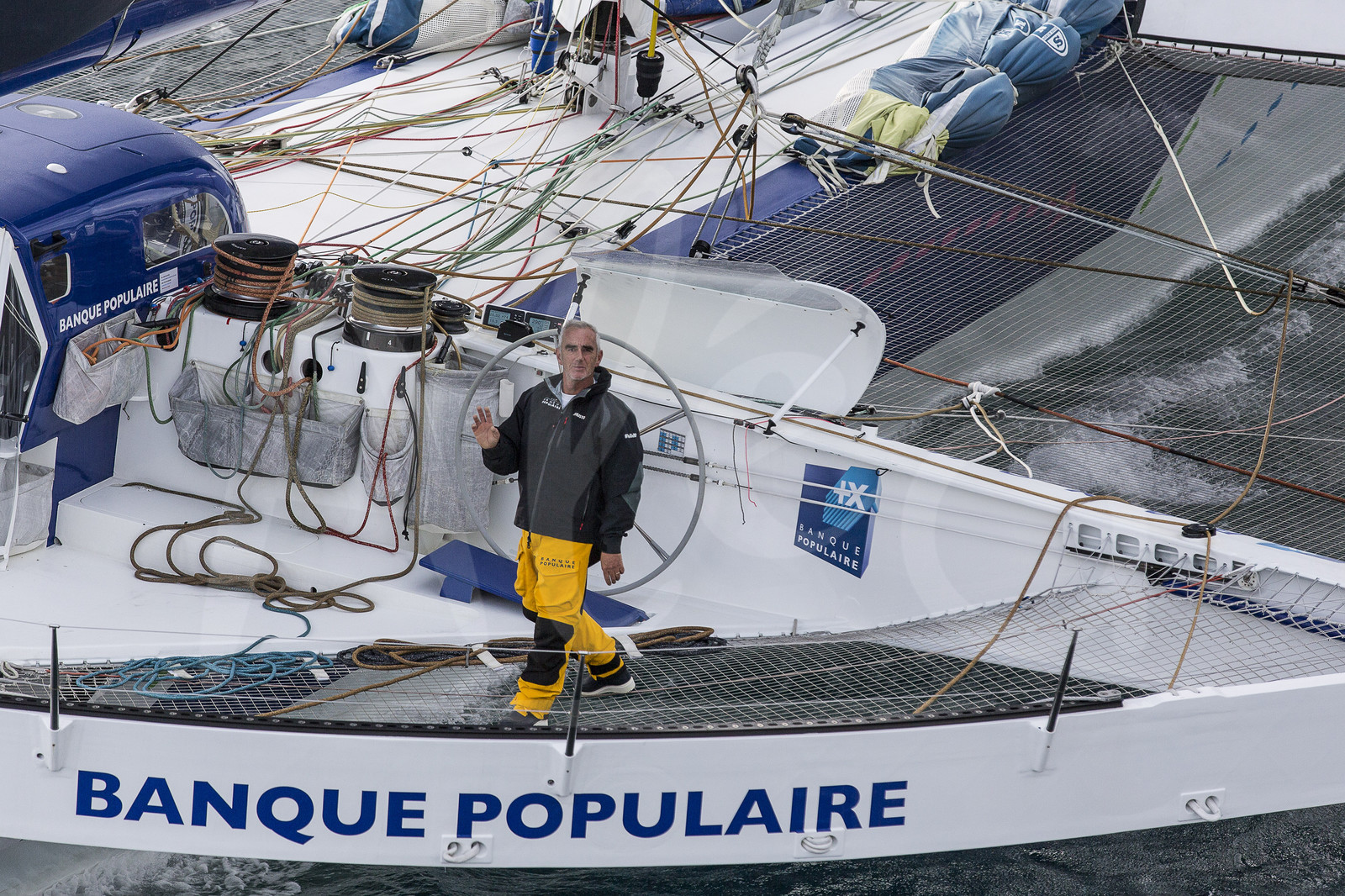 | Description | Loick Peyron, skipper of the maxi trimaran Banque Populaire VII waving at photographer in action during the Route du Rhum sailing race start on november 02, 2014 - Photo Jean Marie Liot / ALEA |