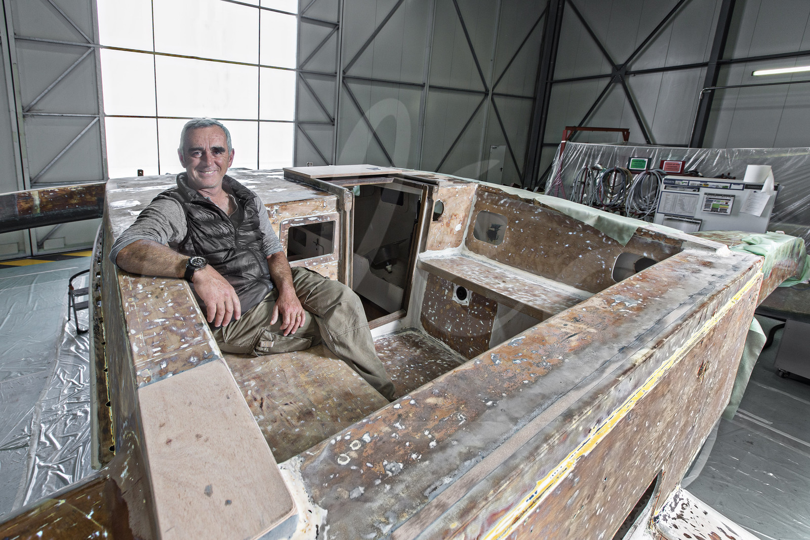 | Description | Loick Peyron "Happy" boat starts in Vannes, Multiplast shipyard, Brittany - Peyron wants to sail this sistership of Mike Birch Olympus Photo, winner of the 1st Route du Rhum 1978, during the 2014 edition, using old method - april 22, 2014 - Photo Jean Marie Liot / ALEA |