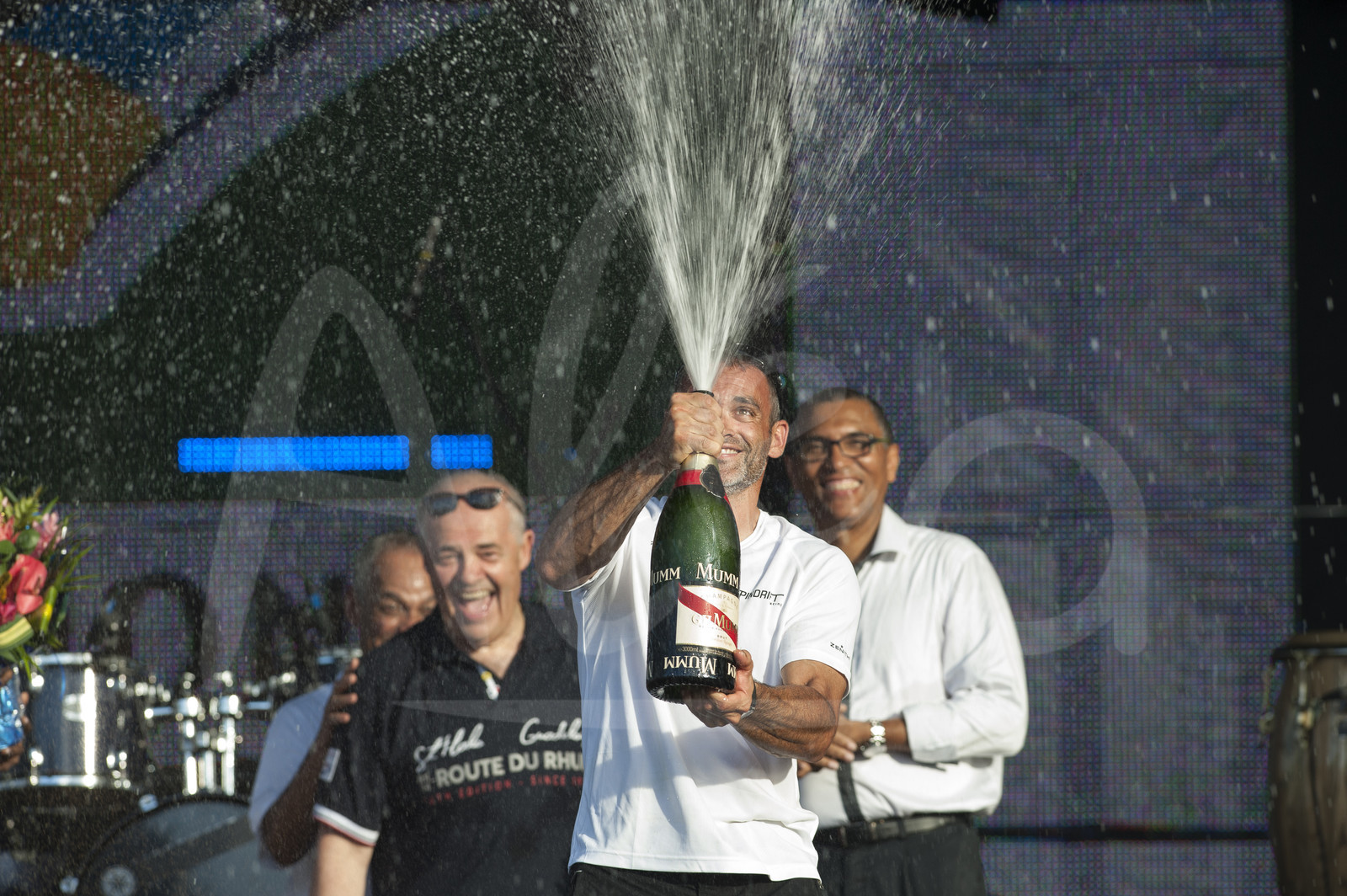 | Description | Yann Guichard, skipper of the maxi trimaran Spindrift 2, Ultime category, celebrates with champagne on the podium after finishing 2nd in the Route du Rhum Destination Guadeloupe, in Pointe ‡ Pitre, Guadeloupe, on november 10, 2014 - Photo Olivier Blanchet / ALEA |