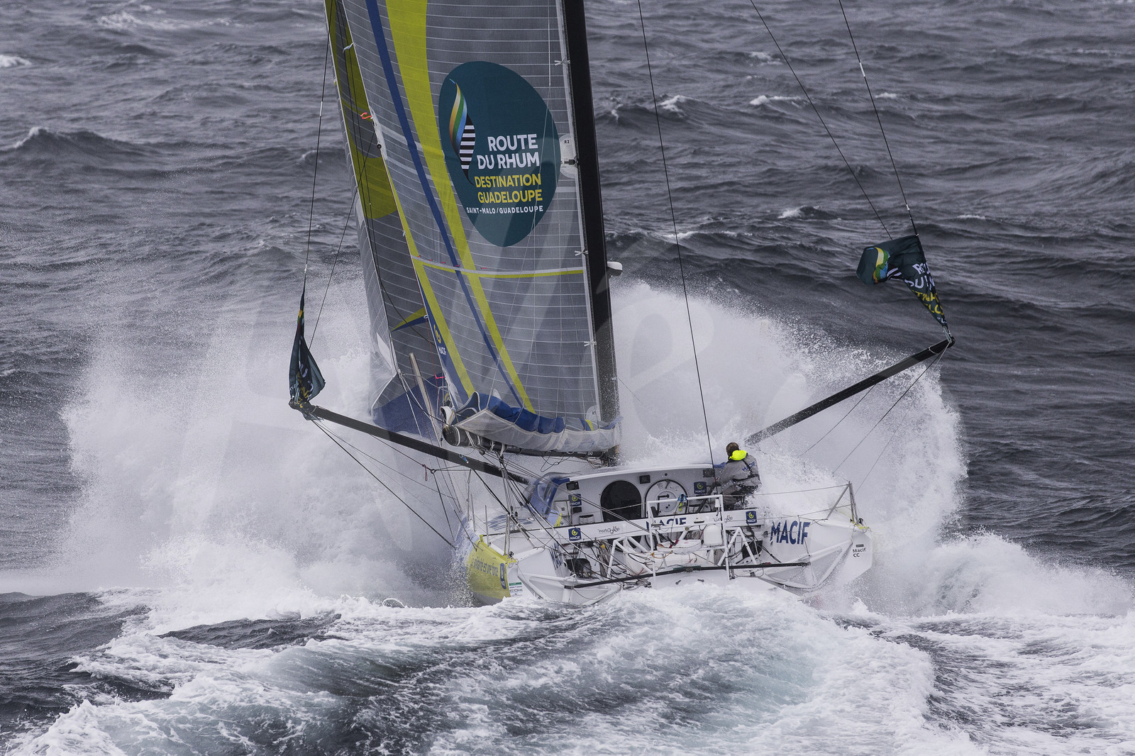 | Description | Aerial view of the IMOCA MACIF with french skipper Francois Gabart training in bad weather off Groix Island, south brittany, prior to the Route du Rhum Destination Guadeloupe on october 06, 2014 - Photo Jean Marie Liot / ALEA |