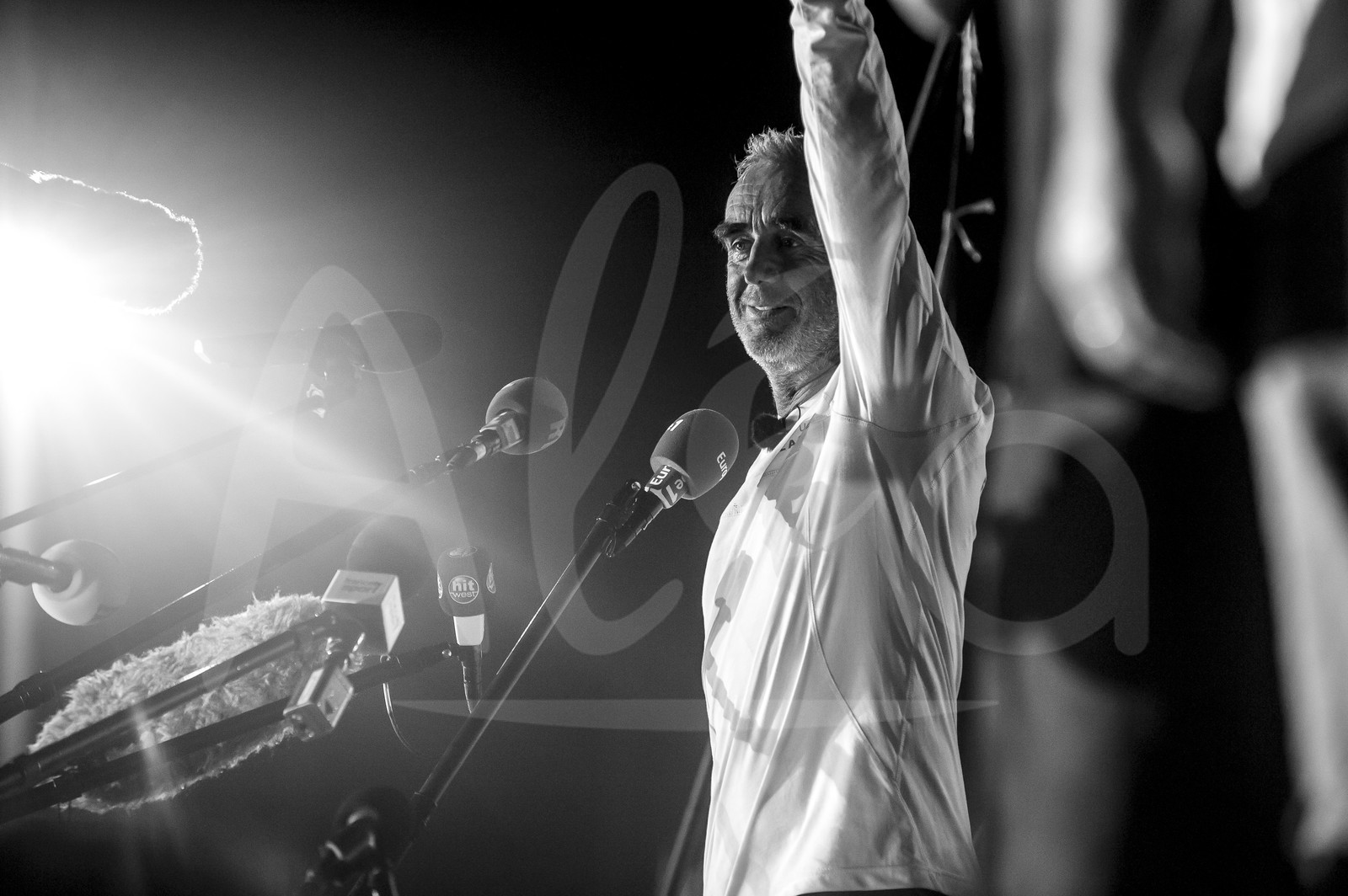 | Description | Loick Peyron, skipper of the maxi trimaran Banque Populaire VII, Ultime category, breaks the historical record and wins the Route du Rhum Destination Guadeloupe in 7d 15h 8mn 32s, in Pointe ‡ Pitre, Guadeloupe, on november 10, 2014 - Photo Olivier Blanchet / ALEA |
