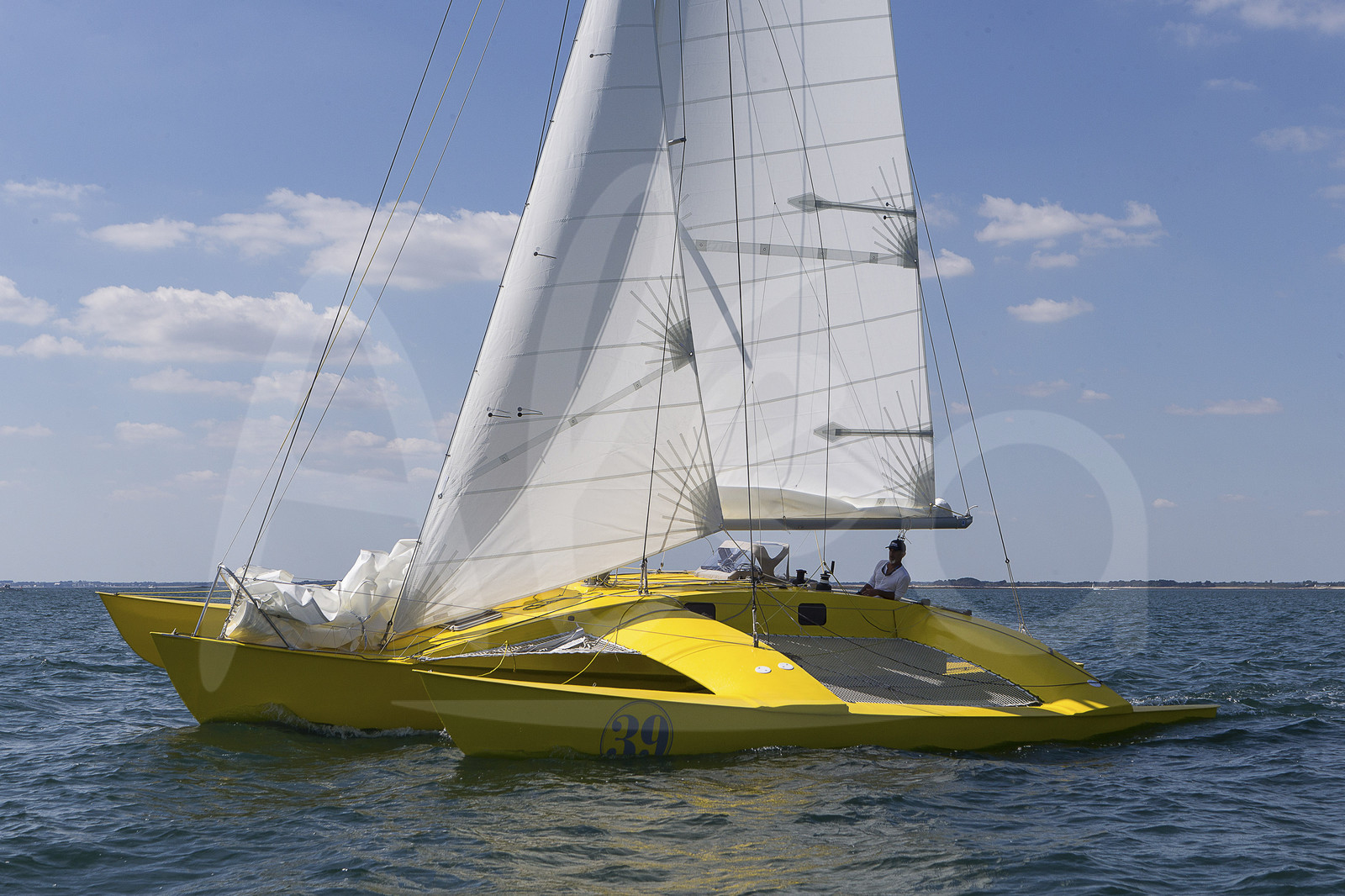| Description | Very first sail for Loick Peyron "Happy" boat off Vannes, Brittany, Peyron wants to sail this sistership of Mike Birch Olympus Photo, winner of the 1st Route du Rhum 1978, during the 2014 edition, using old method - june 19, 2014 - Photo Jean Marie Liot / ALEA |