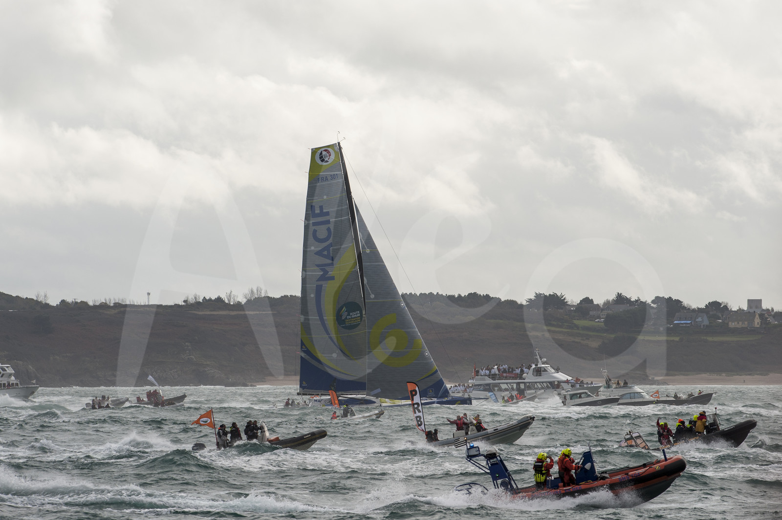 | Description | Francois Gabart, skipper of the Imoca MACIF in action during the Route du Rhum sailing race start on november 02, 2014 - Photo Olivier Blanchet / ALEA |