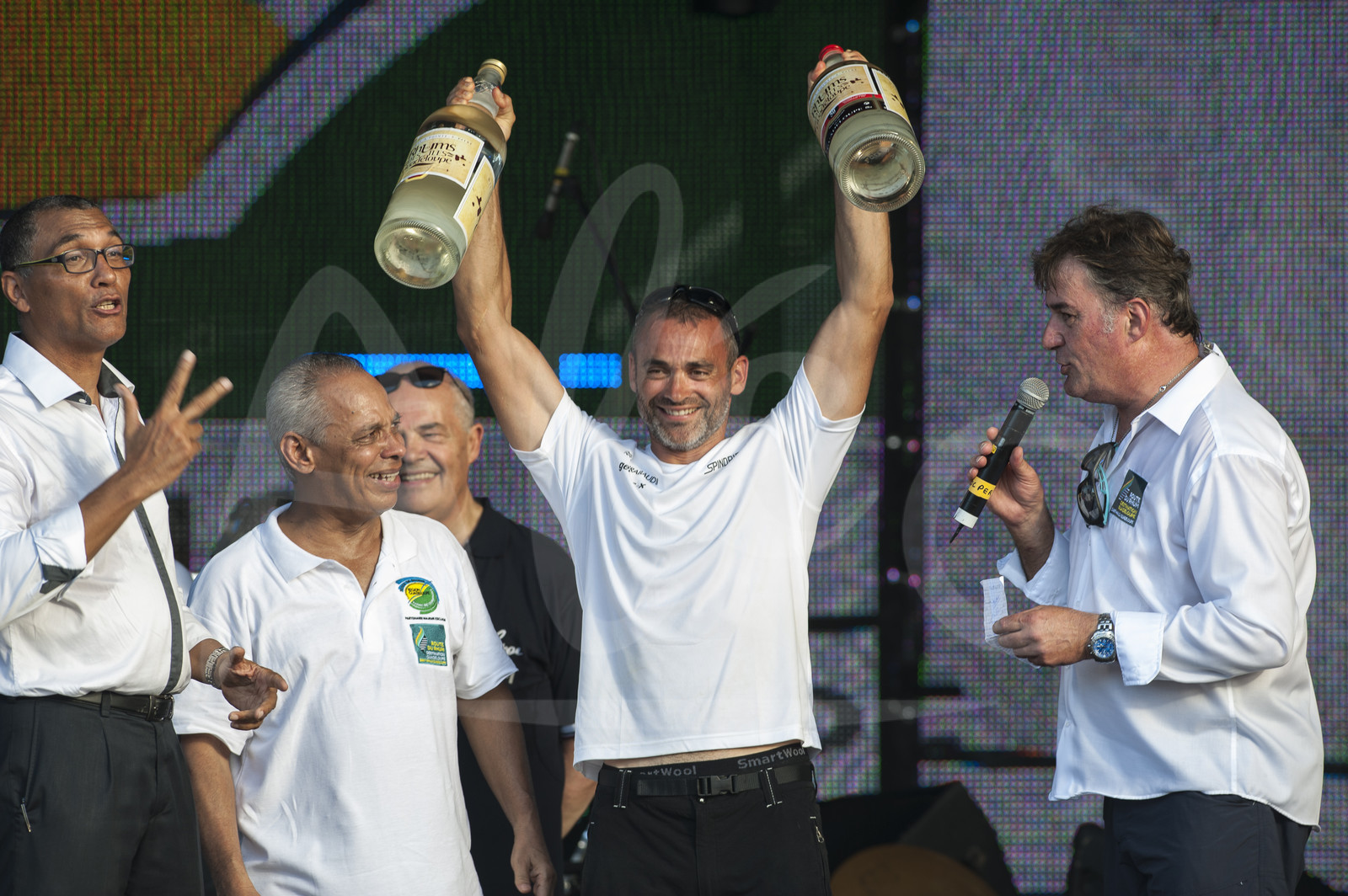 | Description | Yann Guichard, skipper of the maxi trimaran Spindrift 2, Ultime category, on the podium with rhum bottles after finishing 2nd in the Route du Rhum Destination Guadeloupe, in Pointe ‡ Pitre, Guadeloupe, on november 10, 2014 - Photo Olivier Blanchet / ALEA |