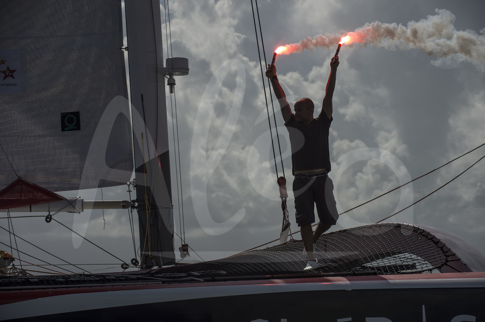 | Description | Erwan Le Roux, skipper of the multihull FenetreA Cardinal, Multi 50 category, celebrates winning the Route du Rhum Destination Guadeloupe in 11d 05h 13mn 55s in Pointe ‡ Pitre, Guadeloupe, on november 13, 2014 - Photo Olivier Blanchet / ALEA |