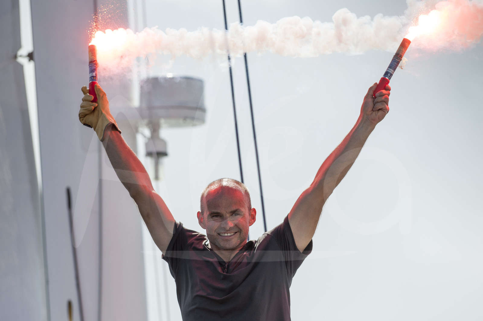| Description | Erwan Le Roux, skipper of the multihull FenetreA Cardinal, Multi 50 category, celebrates winning the Route du Rhum Destination Guadeloupe in 11d 05h 13mn 55s in Pointe ‡ Pitre, Guadeloupe, on november 13, 2014 - Photo Olivier Blanchet / ALEA |
