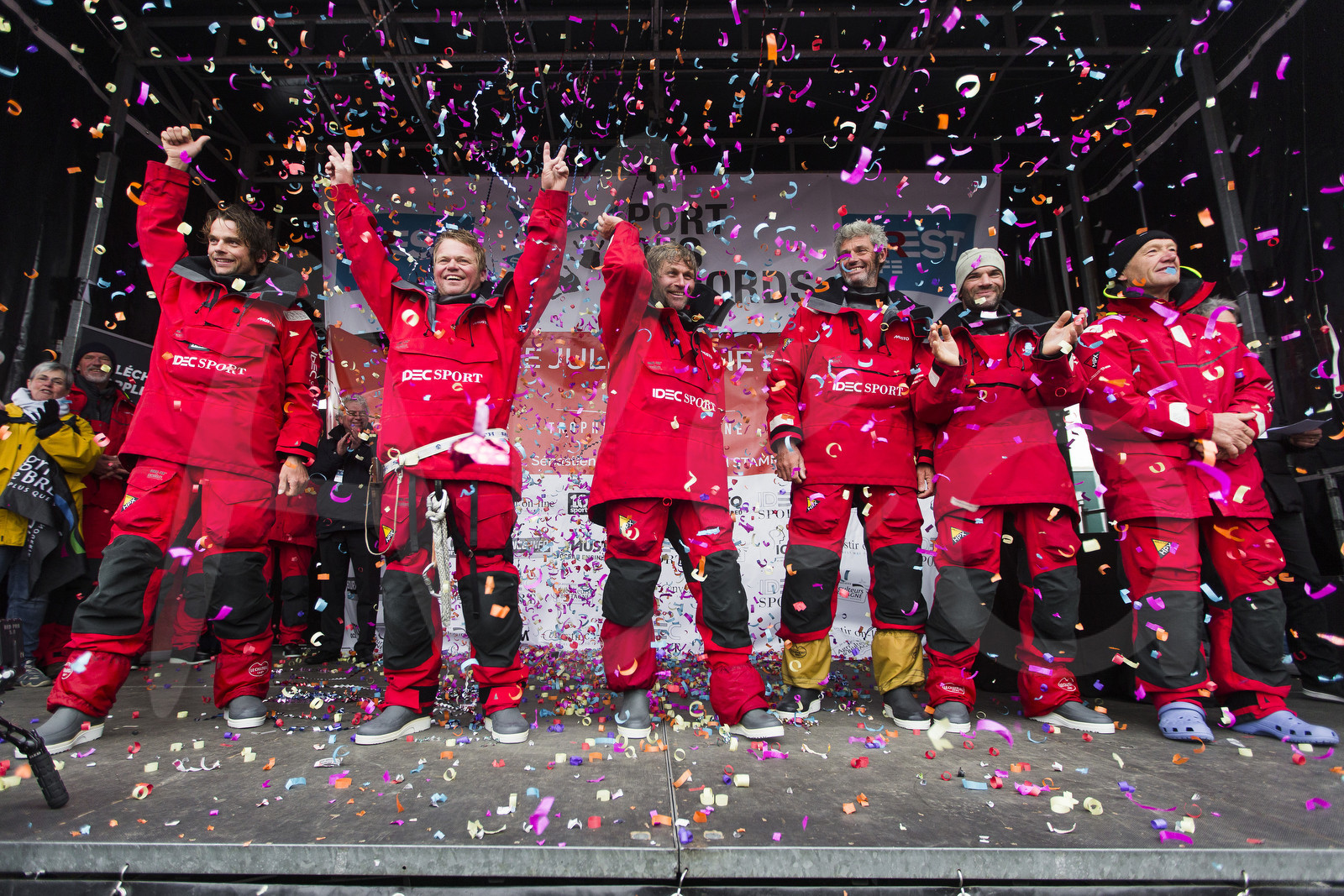 | Description | Maxi Trimaran IDEC SPORT, Skipper Francis Joyon and his crew, break the Jules Verne Trophy record, crew circumnavigation, in 40d 23h 30min 30sec, in Brest on January 26, 2017 - Photo Jean-Marie Liot / Alea.Celebration on podium |
