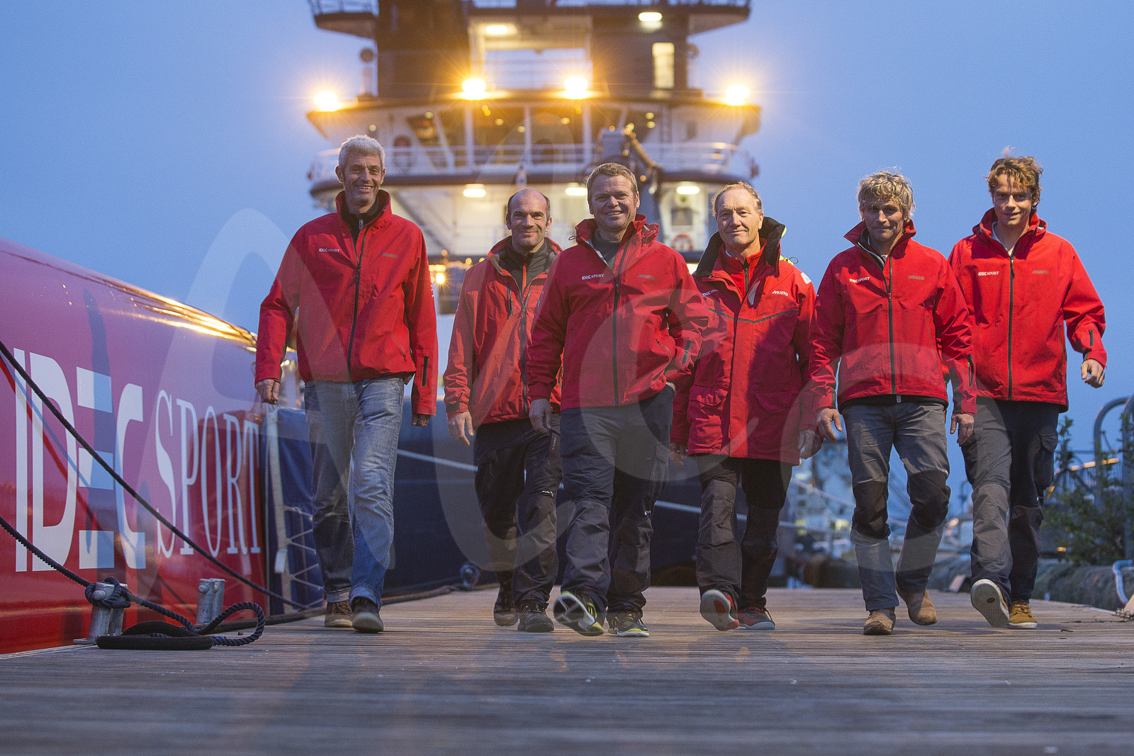 | Description | Maxi Trimaran IDEC SPORT, Skipper Francis Joyon and his crew (from left to right) Sebastien Audigane, Clement Surtel, Alex Pella, Bernard Stamm, Gwenole Gahinet, prior to their Jules Verne Trophy record attempt, crew circumnavigation, in Brest on December 15, 2016 - Photo Jean-Marie Liot / Alea |