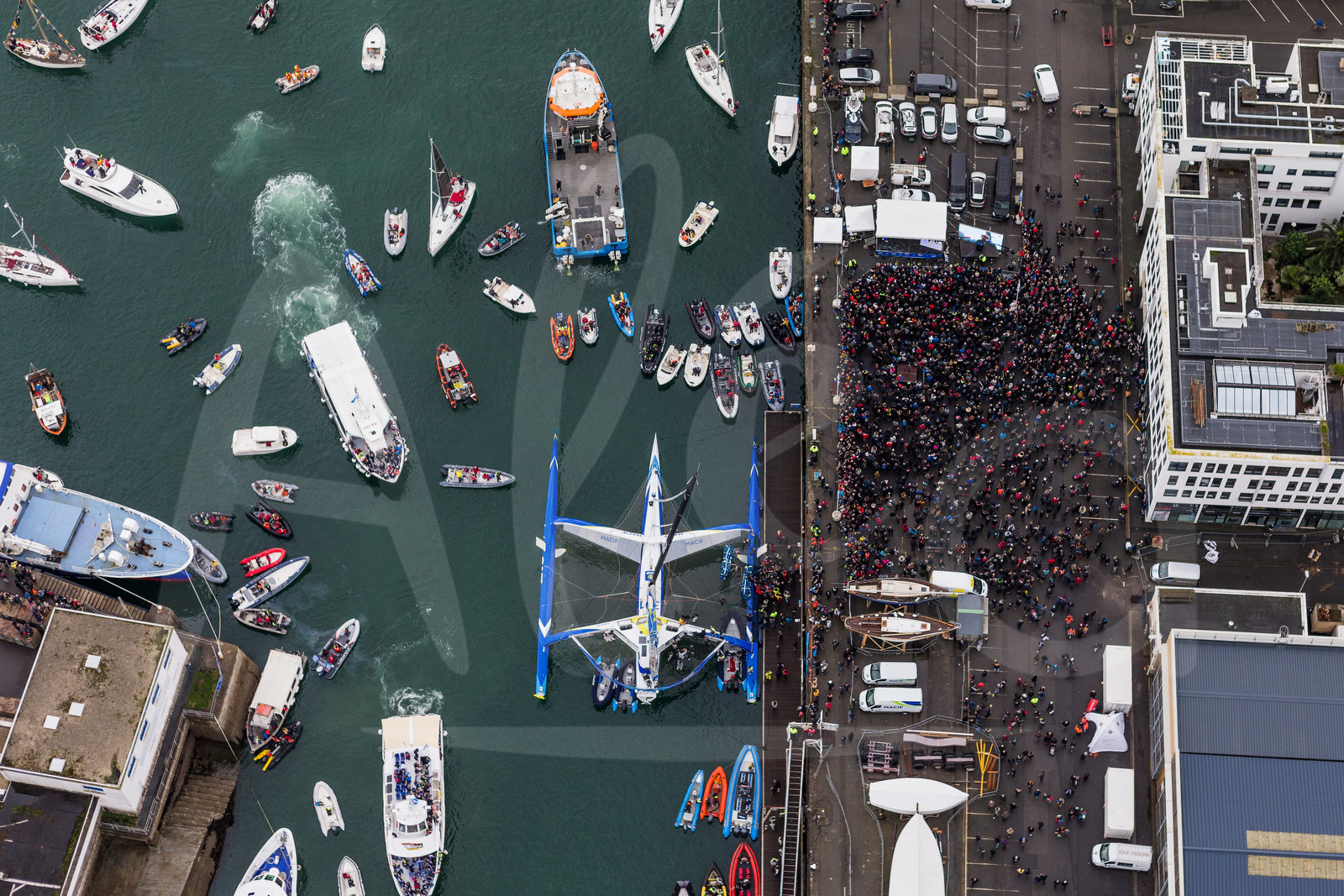 | Description | Celebration with public at pontoon with officials and sponsors during Solo sailing circumnavigation record for Trimaran MACIF, skipper Francois Gabart, in 42d 16h 40mn 35s in Brest, France, on December 17th, 2017 - Photo Jean-Marie Liot / ALeA / Macif |