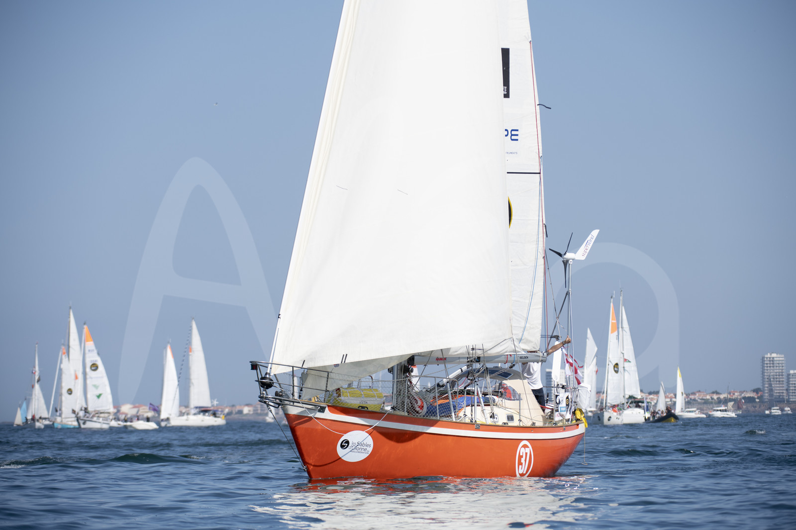 | Description | Golden Globe Race Start - Istvan Kopar (USA) - Puffin, in Les Sables d'Olonne, France, on July 1st, 2018 - Photo Olivier Blanchet / AleA |