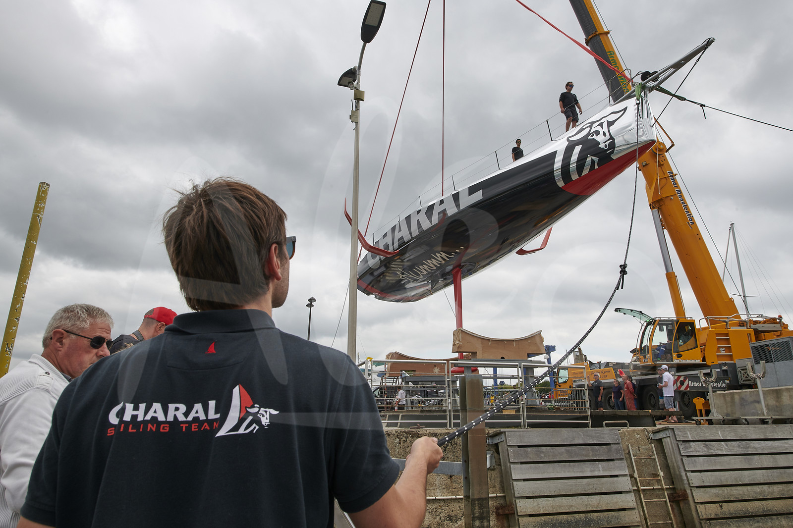 | Description | Launching of the new IMOCA CHARAL, skipper Jeremie BEYOU, at CDK shipyard in Port La Foret (France), on August 22nd, 2018 - Photo Yvan Zedda / Alea |
