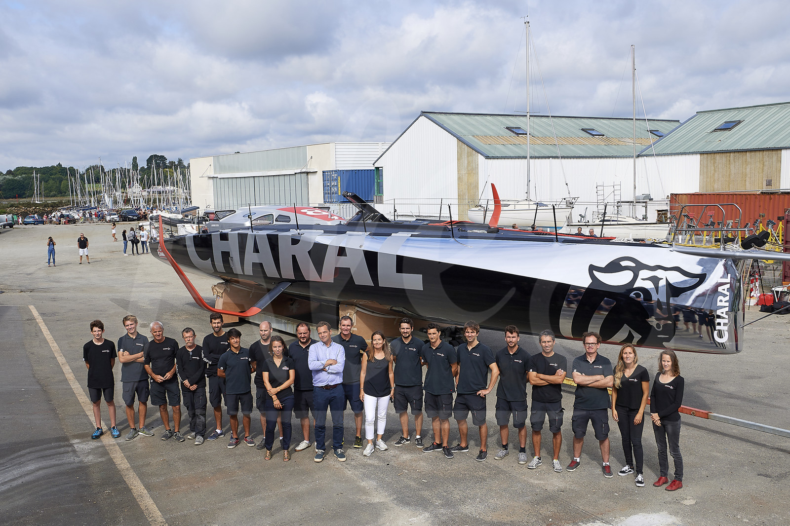| Description | Charal Sailing Team during reveal of the new IMOCA CHARAL, skipper Jeremie BEYOU, with Guy LEPEL-COINTET (marketing director Groupe Bigard), Chloe MOULIER (head of project) and Stephanie BERARD-GEST (marketing director Charal) at CDK shipyard in Port La Foret (France), on August 21st, 2018 - Photo Yvan Zedda / Alea |