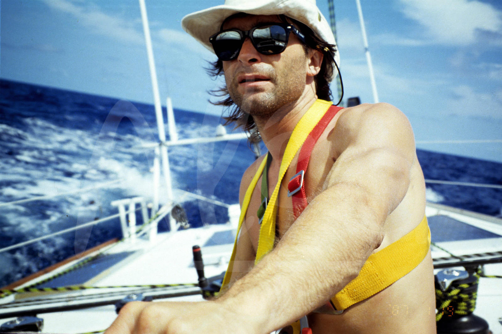 DescriptionSkipper Titouan Lamazou (future winner) onboard Ecureuil d'Aquitaine 2, self portrait during the solo sailing round-the-world yacht race Vendee Globe, first edition, in November 1989 © Titouan Lamazou / Alea
