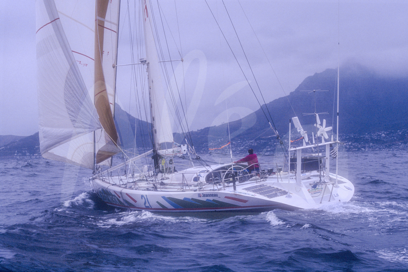 | Description | Archives Vendée Globe 1989-90, premier Vendée Globe, Fleury Michon lors de son arrivée à Capetown après son chavirage survenu le 27 décembre 1989 - Le skipper Philippe Poupon est resté 36 heures couché avant que Loïck Peyron sur Lada Poch ne le remorque pour enfin le redresser - le 29 décembre 1989, Capetown, South Africa - Photo Bernard Rubinstein / Alea |