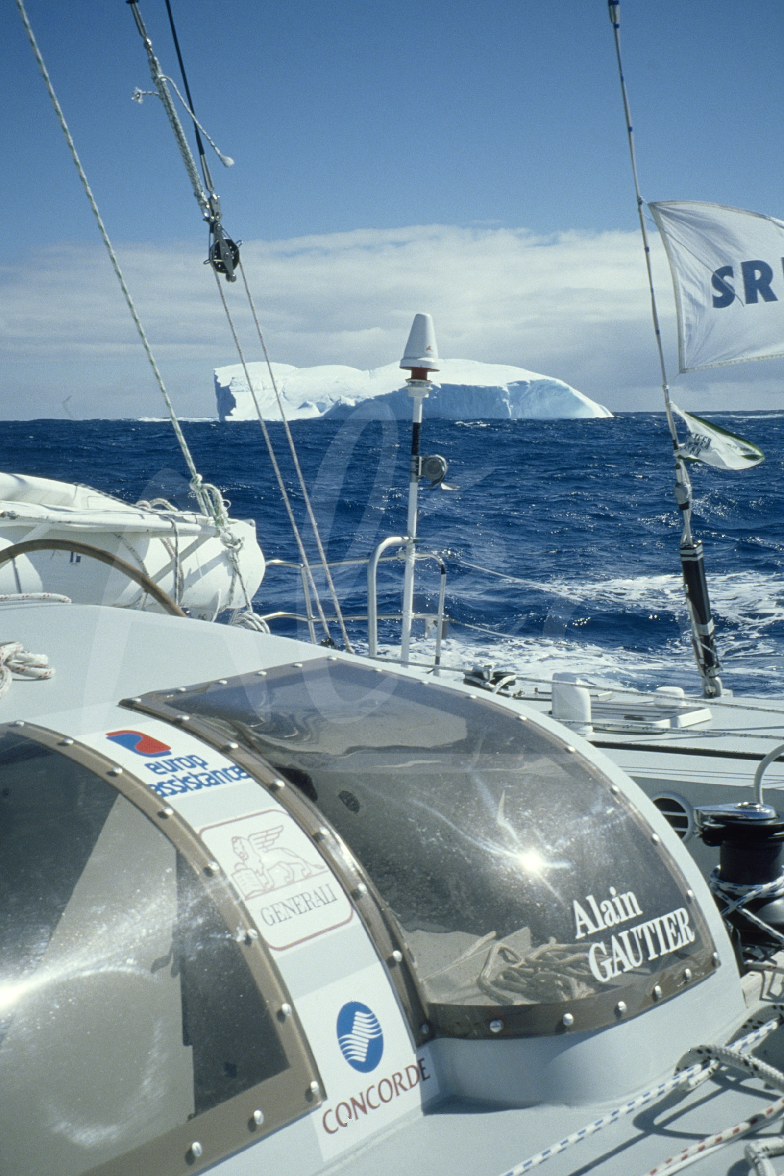 | Description | French skipper Alain GAUTIER, Concorde Generali, crossing an iceberg in Antarctica during the sailing round-the-world yacht race Vendee Globe, first edition, on December, 1989 © Alain Gautier / Alea |