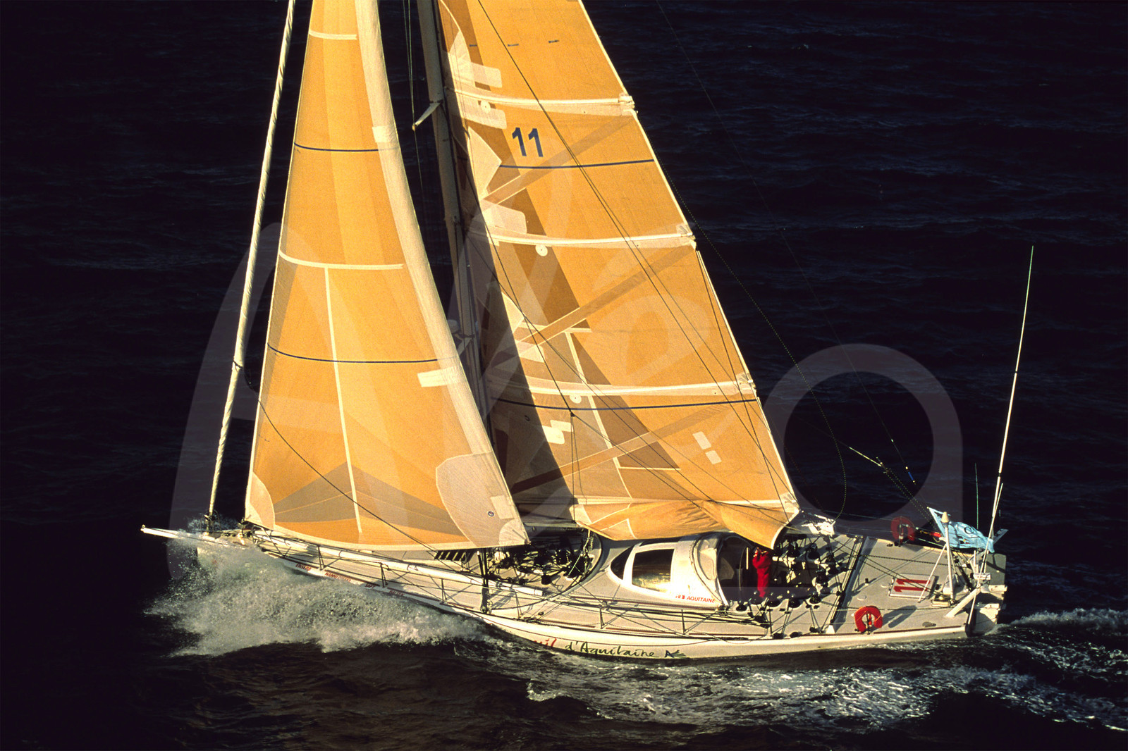 | Description | Finish for winner Skipper Titouan Lamazou onboard Ecureuil d'Aquitaine 2, during the solo sailing round-the-world yacht race Vendee Globe, first edition, in March 1990 © Jacques Vapillon / Alea |