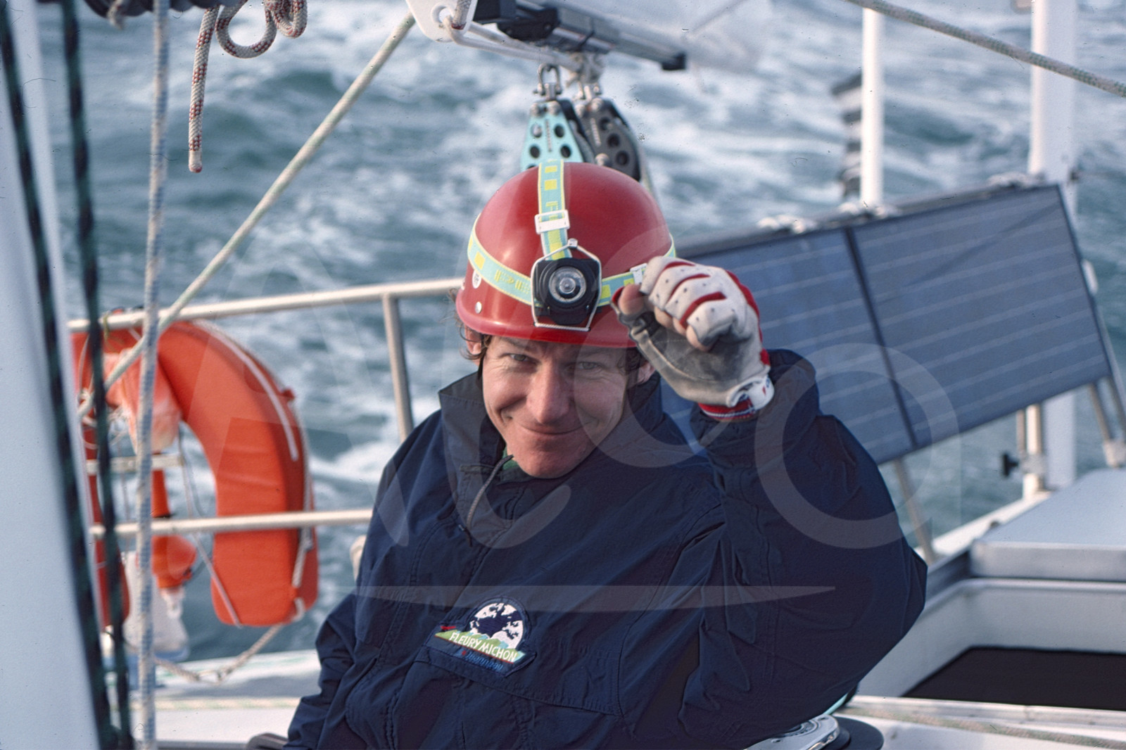 | Description | Philippe POUPON, French skipper of IMOCA boat Fleury Michon X during start of the sailing round-the-world yacht race Vendee Globe, first edition, on November 26th, 1989 © Bernard Rubinstein / Alea |
