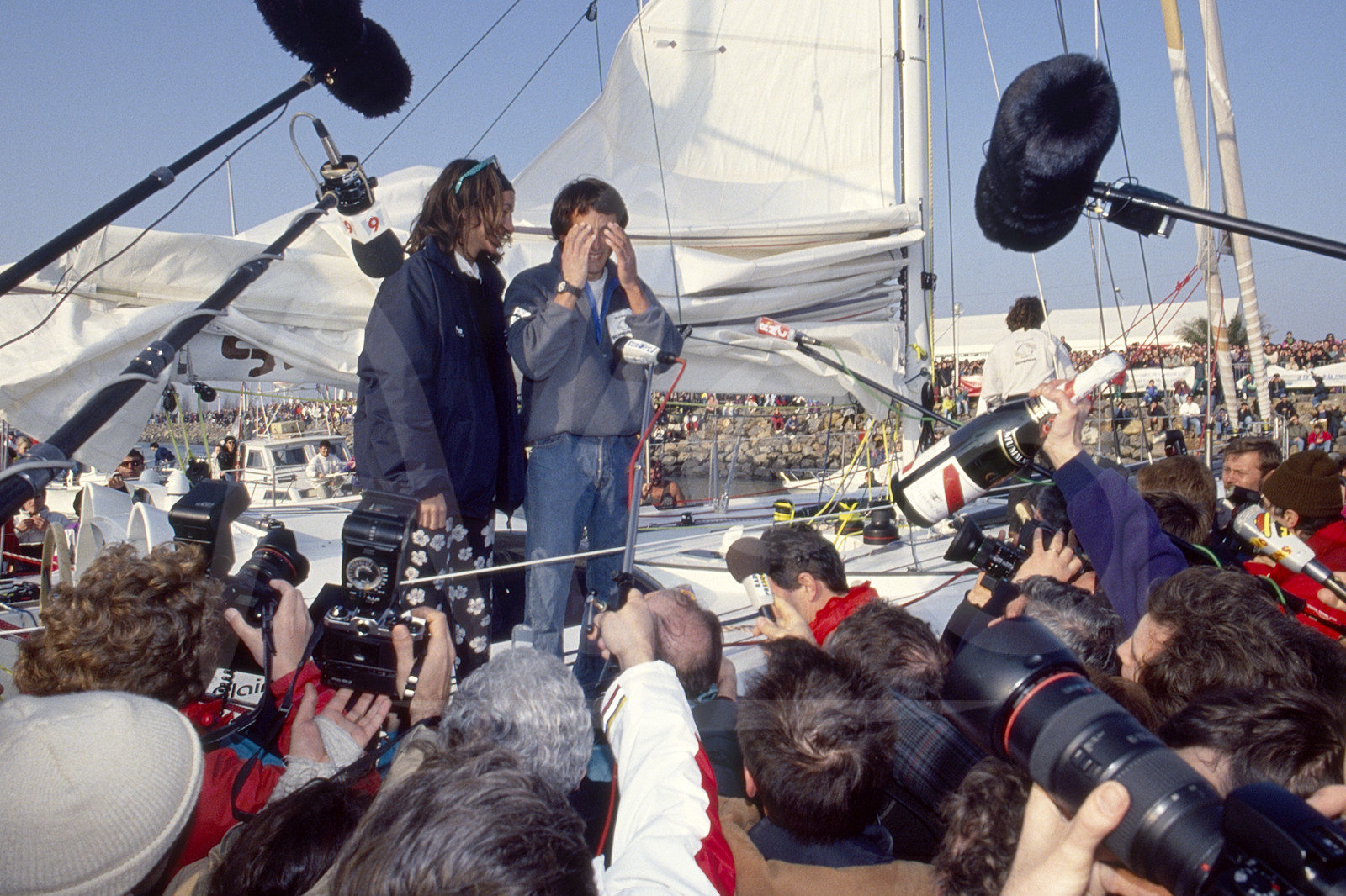 | Description | Celebration for winner Alain GAUTIER, Bagages Superior, in the channel after crossing the finish line of the round-the-world solo sailing yacht race Vendee Globe in Les Sables d'Olonne, West France, on March 13th, 1993, in 110d 02h 22mn 35s - © Bernard Rubinstein / Alea |