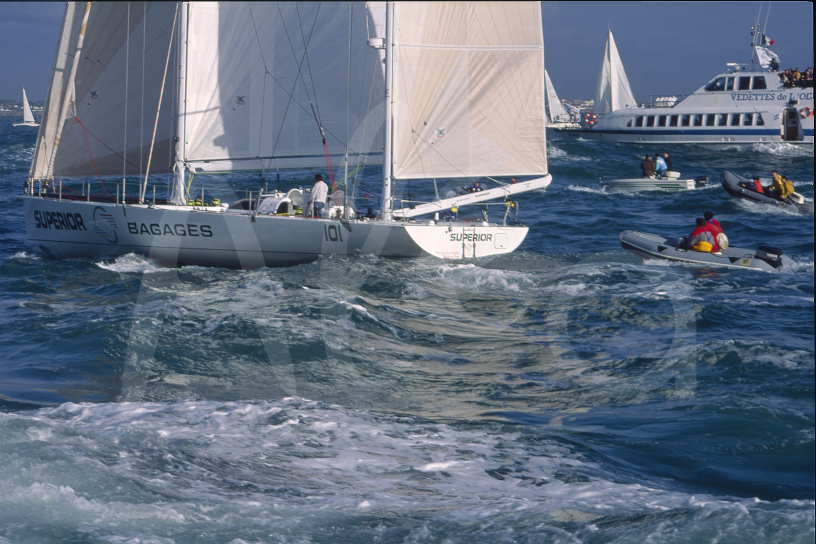 | Description | Alain GAUTIER, Bagages Superior, during start of the round-the-world solo sailing yacht race Vendee Globe in Les Sables d'Olonne, West France, on November 22nd, 1992 - © Bernard Rubinstein / Alea |