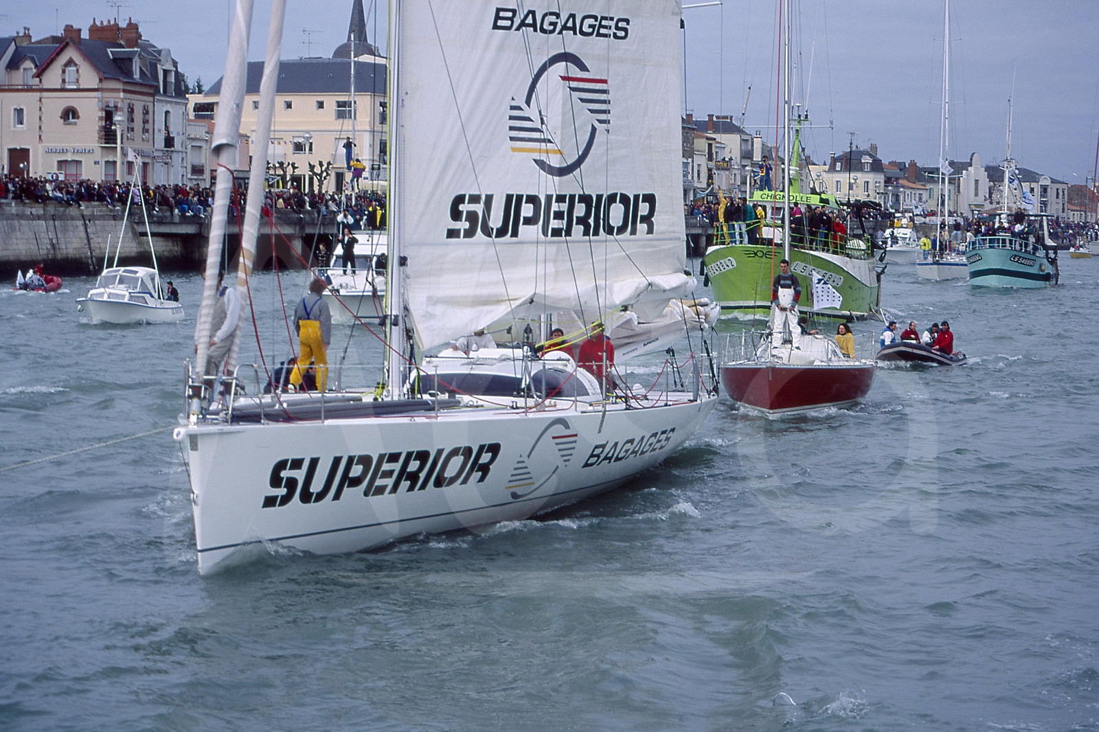 | Description | Alain GAUTIER, Bagages Superior, being towed in the channel before start of the round-the-world solo sailing yacht race Vendee Globe in Les Sables d'Olonne, West France, on November 22nd, 1992 - © Bernard Rubinstein / Alea |