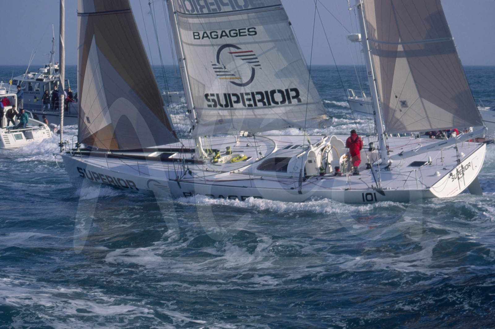 | Description | Winner Alain GAUTIER, Bagages Superior, on the finish line of the round-the-world solo sailing yacht race Vendee Globe in Les Sables d'Olonne, West France, on March 13th, 1993, in 110d 02h 22mn 35s - © Bernard Rubinstein / Alea |
