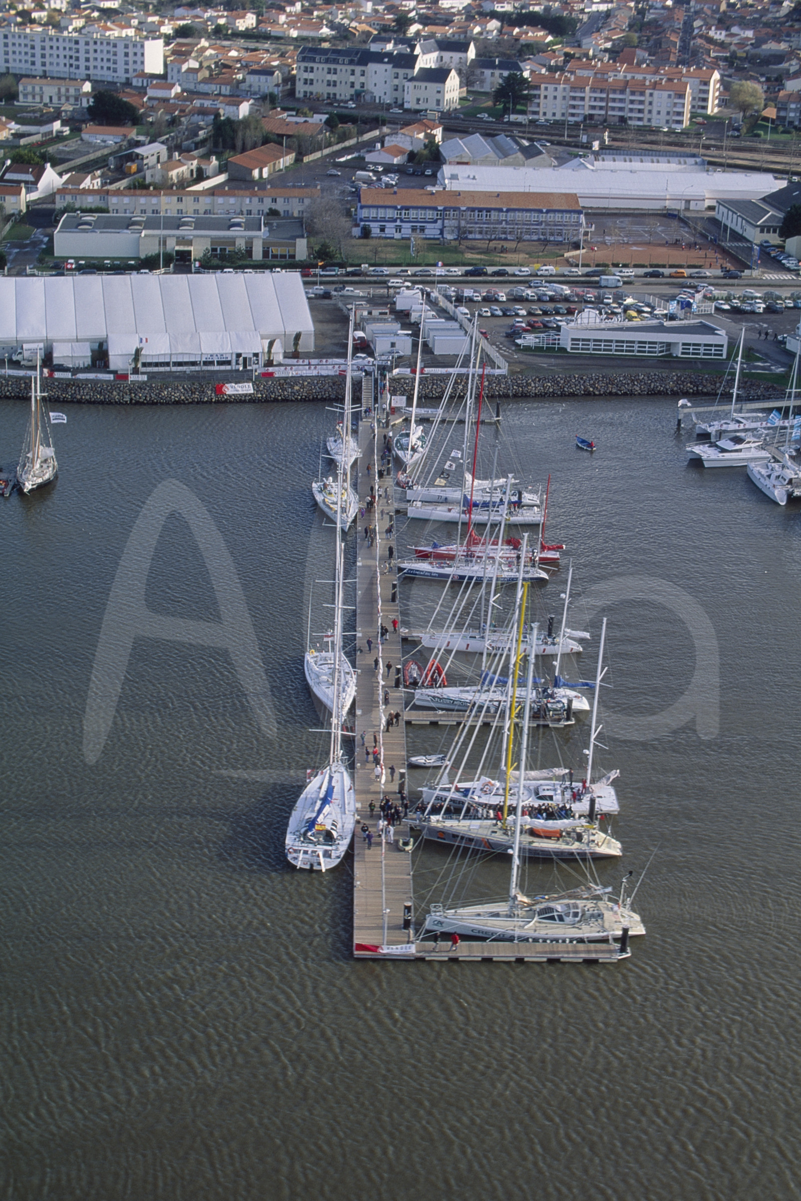 | Description | Aerial view of the boats at pontoon before start of the round-the-world solo sailing yacht race Vendee Globe in Les Sables d'Olonne, West France, on November 22nd, 1992 - © Jacques Vapillon / Alea |