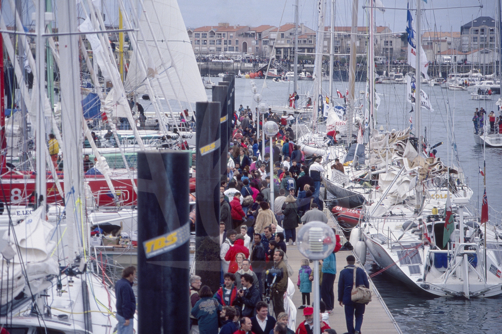 | Description | Illustration of the pontoons before start of the round-the-world solo sailing yacht race Vendee Globe in Les Sables d'Olonne, West France, on November 22nd, 1992 - © Bernard Rubinstein / Alea |