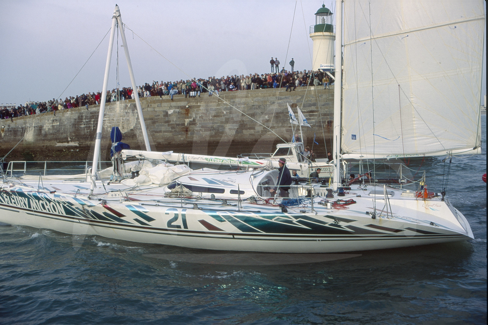 | Description | Philippe POUPON, Fleury Michon X, arrives under jury rig after his boat had dismasted 1000 nm before finish line, he will finally finish 3rd of the round-the-world solo sailing yacht race Vendee Globe in Les Sables d'Olonne, West France, on March 19th, 1993 - © Bernard Rubinstein / Alea |