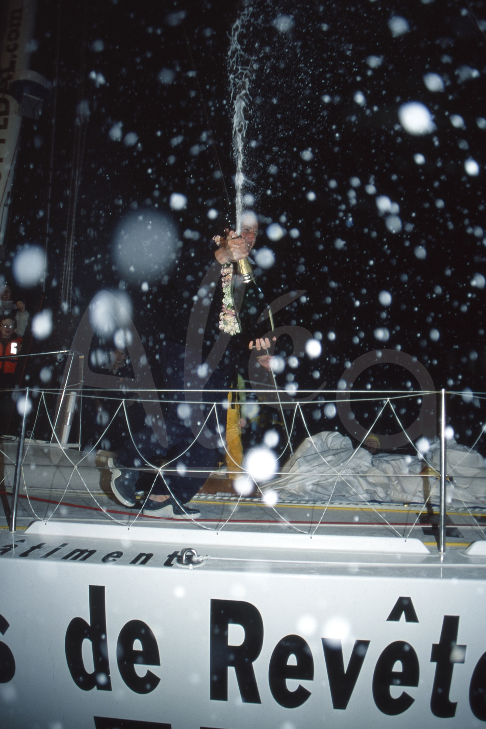 | Description | Arrival and champagne for winner Michel DESJOYEAUX, PRB, of the round-the-world solo sailing yacht race Vendee Globe in Les Sables d'Olonne, West France, on February 10th, 2001 in 93D 3H 57MN - © Bernard Rubinstein / Alea |