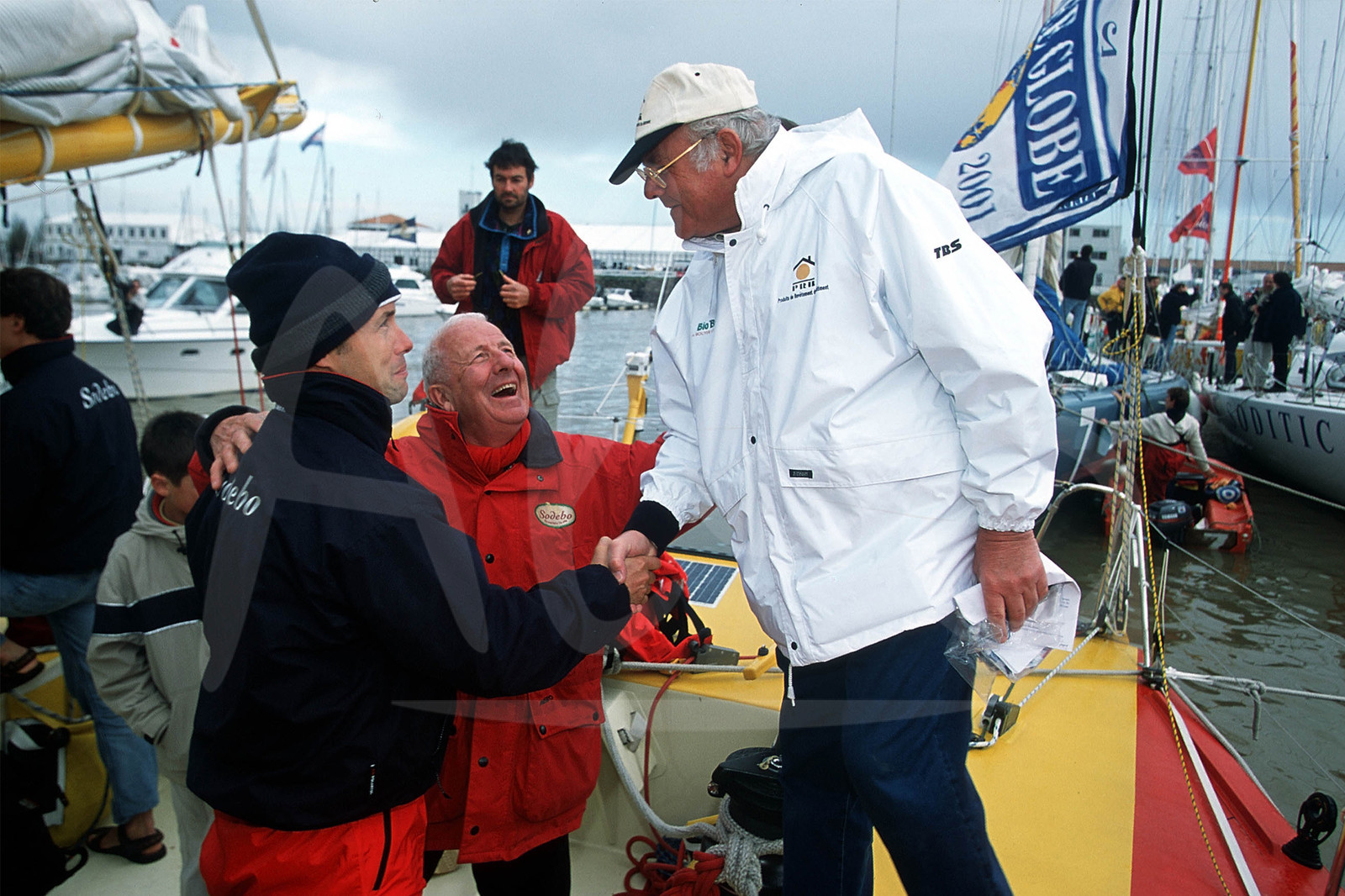 | Description | Illustration of Thomas Coville, Sodebo, with sponsor's chairman Joseph Bougro, and PRB chairman Jacques Laurent, before start of the world sailing race Vendee Globe, 4th edition, in the Atlantic Ocean, on November 9th, 2000 - Photo Jean-Marie Liot / ALEA . |