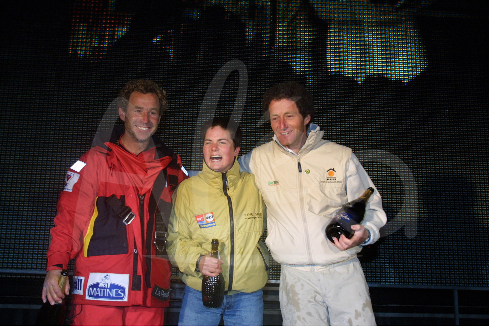 | Description | Podium for 3rd Roland Jourdain, Sill, 2nd Ellen Macarthur, Kingfisher and Winner Michel Desjoyeaux, PRB, of the solo round the world sailing race Vendee Globe, 4th edition, in Les Sables d'Olonne, on February 13th, 2001 - Photo Jean-Marie Liot / ALEA . |