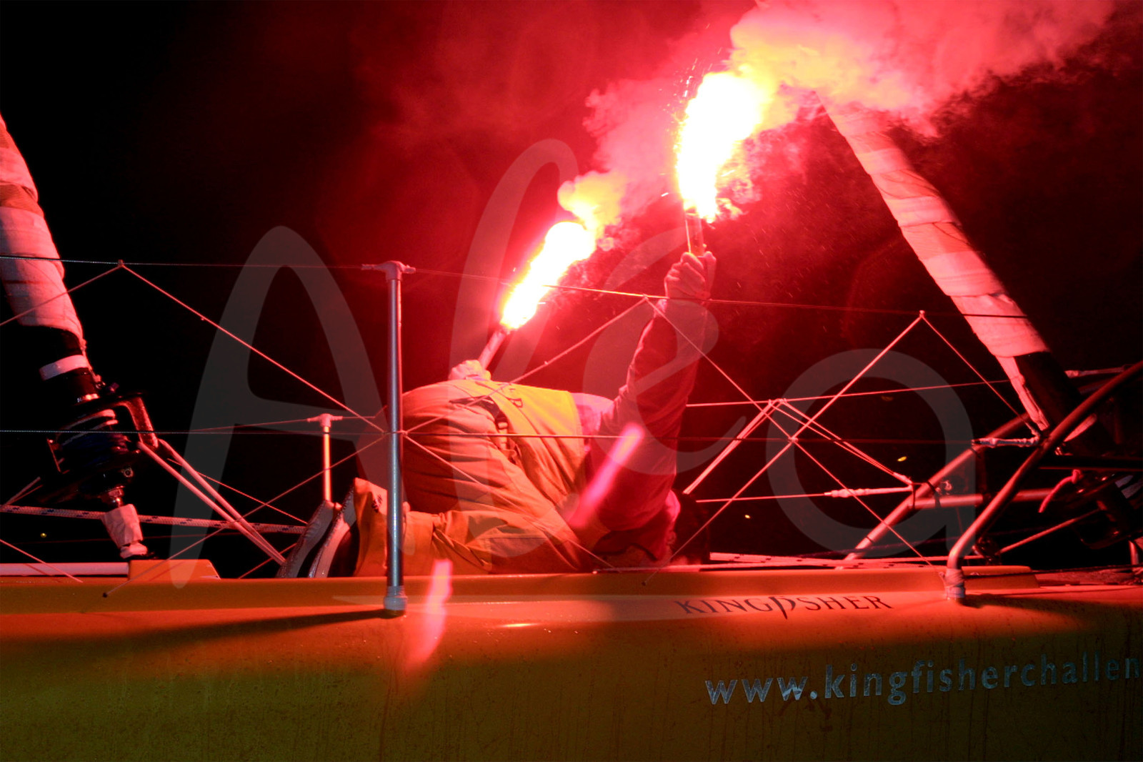 | Description | Arrival for Ellen Macarthur, Kingfisher, celebrating with flares in the channel after finishing 2nd of the solo round the world sailing race Vendee Globe, 4th edition, in Les Sables d'Olonne, on February 11th, 2001 - Photo Jean-Marie Liot / ALEA . |